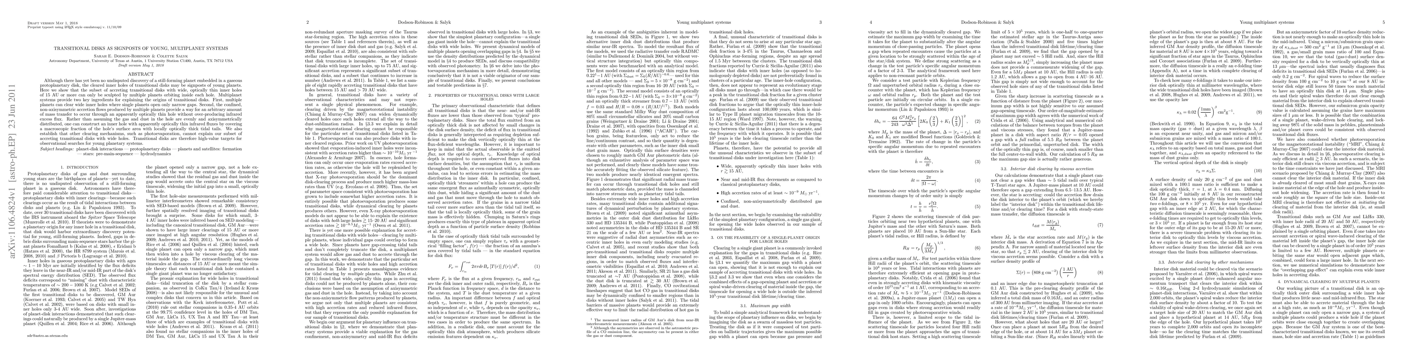 This paper argues that transitional disks with wide, optically thin inner holes are likely shaped by multiple planets within the disk, providing evidence for the existence of young, multiplanet systems. It suggests that these planets clear wider gaps than single planets and facilitate non-axisymmetric accretion flows, supporting the formation of transitional disks.