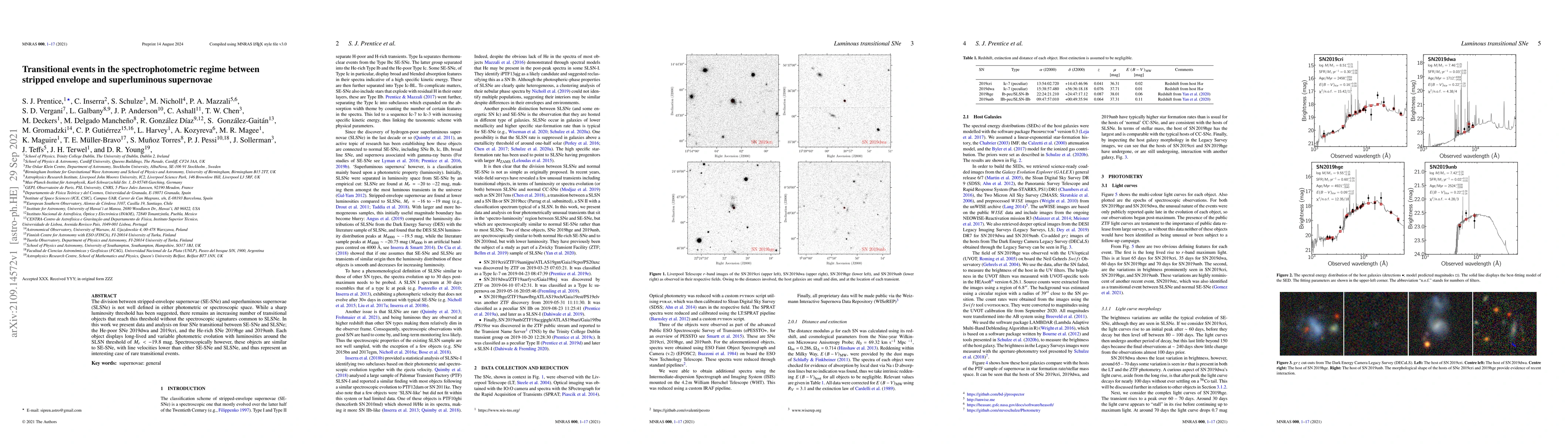The division between stripped-envelope supernovae (SE-SNe) and superluminous supernovae (SLSNe) is not well defined in either photometric or spectroscopic space. While a sharp luminosity threshold has been suggested, there remains an increasing number of transitional objects that reach this threshold without the spectroscopic signatures common to SLSNe. In this work we present data and analysis on four SNe transitional between SE-SNe and SLSNe; the He-poor SNe 2019dwa and 2019cri, and the He-rich SNe 2019hge and 2019unb. Each object displays long-lived and variable photometric evolution with luminosities around the SLSN threshold of $M_r < -19.8$ mag. Spectroscopically however, these objects are similar to SE-SNe, with line velocities lower than either SE-SNe and SLSNe, and thus represent an interesting case of rare transitional events.