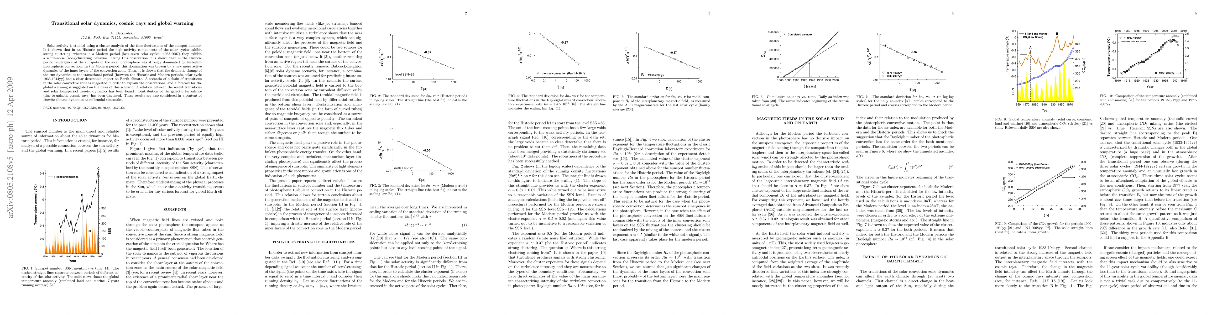 This paper analyzes solar activity and its dynamics, revealing a shift from strong clustering in historic periods to white-noise behavior in modern periods, suggesting a change in solar convection zone dynamics. The study links this transition to detectable impacts on Earth's climate and proposes a scenario for future global warming, considering galactic cosmic rays' influence on solar dynamics and chaotic climate dynamics.