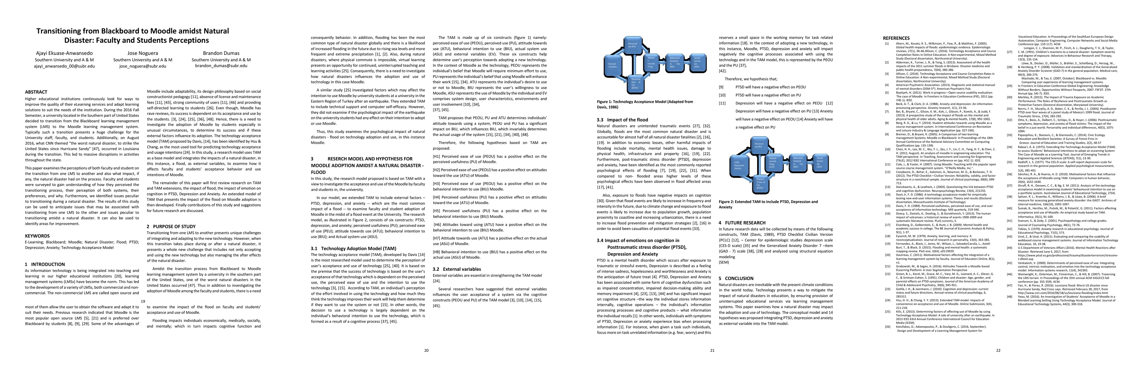 Higher educational institutions continuously look for ways to improve the quality of their eLearning services and adapt learning solutions to suit the needs of the institution. During the 2016 Fall Semester, a university located in the Southern part of United States decided to transition from the Blackboard learning management system (LMS) to the Moodle learning management system. Typically such a transition presents a huge challenge for the University staff, faculty, and students. Additionally, on August 2016, what CNN themedthe worst natural disaster, to strike the United States since Hurricane Sandy, occurred in Louisiana during the transition. This led to massive disruptions in activities throughout the state. This paper examines the perceptions of both faculty and student on the transition from one LMS to another and also what impact, if any, the natural disaster had on the process. Faculty and students were surveyed to gain understanding of how they perceived the transitioning process, their perception of both systems, their preferences, and why. Furthermore, we identified issues peculiar to transitioning during a natural disaster. The results of this study can be used to anticipate issues that may be associated with transitioning from one LMS to the other and issues peculiar to transitioning amidst a natural disaster. It can also be used to identify areas for improvement.