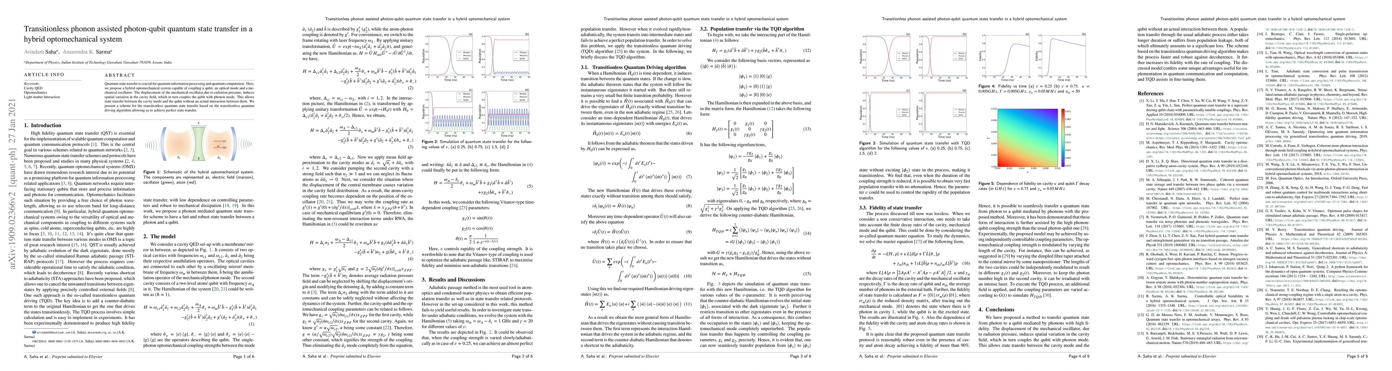 Quantum state transfer is crucial for quantum information processing and quantum computation. Here, we propose a hybrid optomechanical system capable of coupling a qubit, an optical mode and a mechanical oscillator. The displacement of the mechanical oscillator,due to radiation pressure, induces spatial variation in the cavity field, which in turn couples the qubit with phonon mode. This allows state transfer between the cavity mode and the qubit without an actual interaction between them. We present a scheme for the transitionless quantum state transfer based on the transitionless quantum driving algorithm allowing us to achieve perfect state transfer.