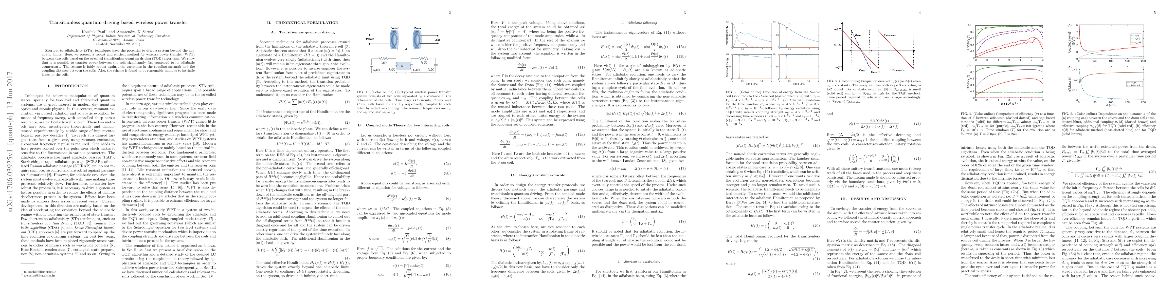 This paper introduces a transitionless quantum driving (TQD) method for wireless power transfer (WPT) that leverages shortcut to adiabaticity techniques to achieve faster power transfer compared to traditional adiabatic methods. The proposed scheme demonstrates robustness against variations in coupling strength and distance, as well as intrinsic coil losses.
