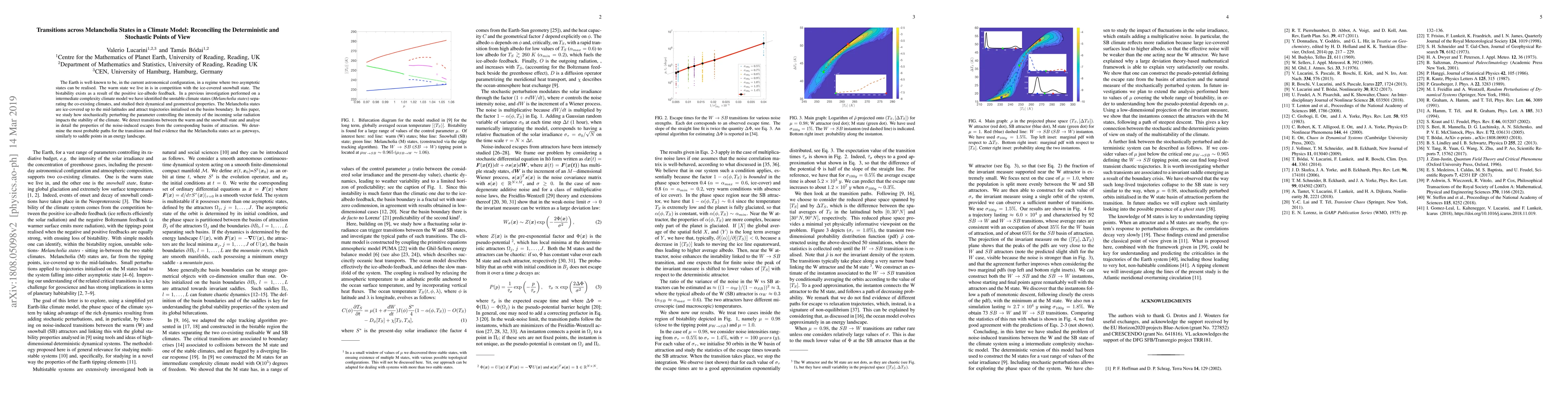 This research paper investigates how stochastic perturbations impact climate stability, detecting transitions between warm and ice-covered states in a climate model, and finding that these states act as gateways for escape from basins of attraction.