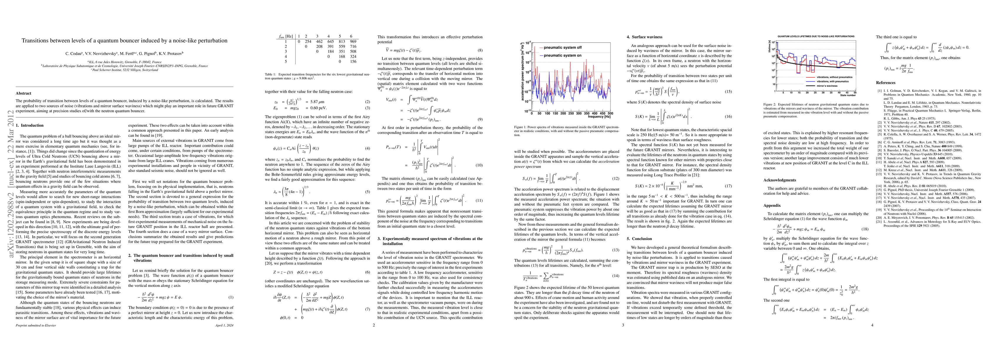 Summary: This paper calculates the probability of transitions between levels in a quantum bouncer due to noise-like perturbations, applying the findings to vibrations and mirror surface waviness relevant to the GRANIT experiment for neutron quantum bouncer precision studies.