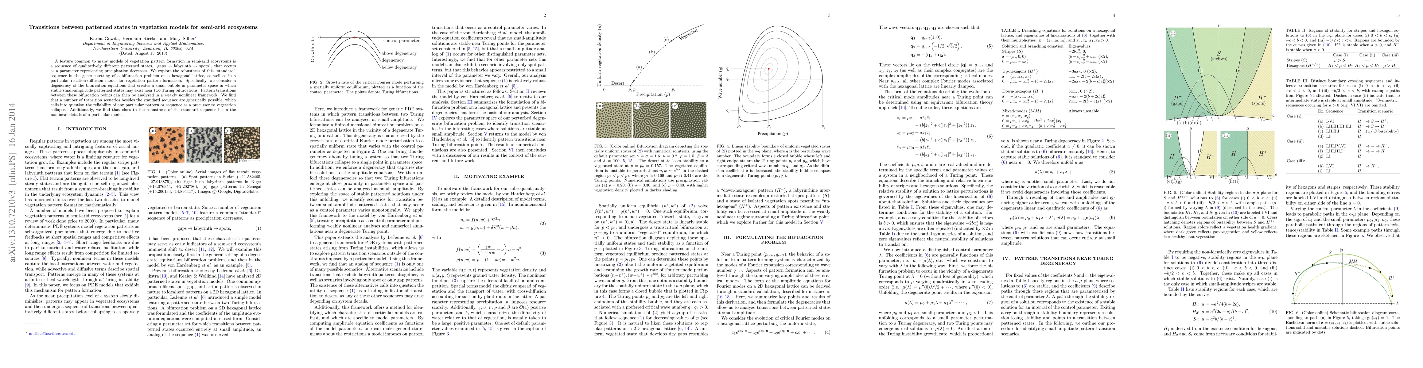 A feature common to many models of vegetation pattern formation in semi-arid ecosystems is a sequence of qualitatively different patterned states, "gaps -> labyrinth -> spots", that occurs as a parameter representing precipitation decreases. We explore the robustness of this "standard" sequence in the generic setting of a bifurcation problem on a hexagonal lattice, as well as in a particular reaction-diffusion model for vegetation pattern formation. Specifically, we consider a degeneracy of the bifurcation equations that creates a small bubble in parameter space in which stable small-amplitude patterned states may exist near two Turing bifurcations. Pattern transitions between these bifurcation points can then be analyzed in a weakly nonlinear framework. We find that a number of transition scenarios besides the standard sequence are generically possible, which calls into question the reliability of any particular pattern or sequence as a precursor to vegetation collapse. Additionally, we find that clues to the robustness of the standard sequence lie in the nonlinear details of a particular model.