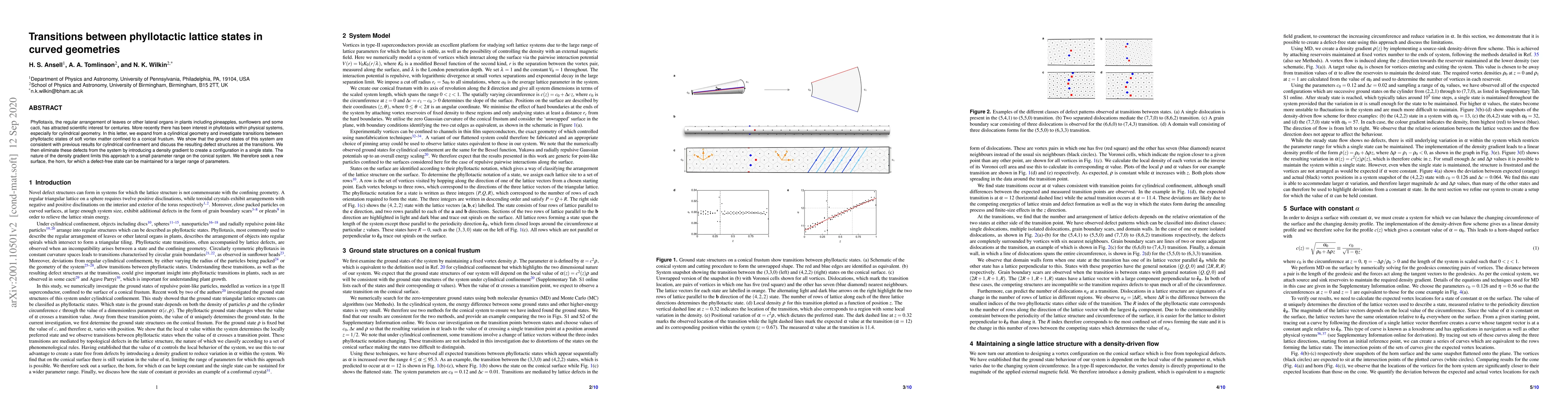 Phyllotaxis, the regular arrangement of leaves or other lateral organs in plants including pineapples, sunflowers and some cacti, has attracted scientific interest for centuries. More recently there has been interest in phyllotaxis within physical systems, especially for cylindrical geometry. In this letter, we expand from a cylindrical geometry and investigate transitions between phyllotactic states of soft vortex matter confined to a conical frustum. We show that the ground states of this system are consistent with previous results for cylindrical confinement and discuss the resulting defect structures at the transitions. We then eliminate these defects from the system by introducing a density gradient to create a configuration in a single state. The nature of the density gradient limits this approach to a small parameter range on the conical system. We therefore seek a new surface, the horn, for which a defect-free state can be maintained for a larger range of parameters.