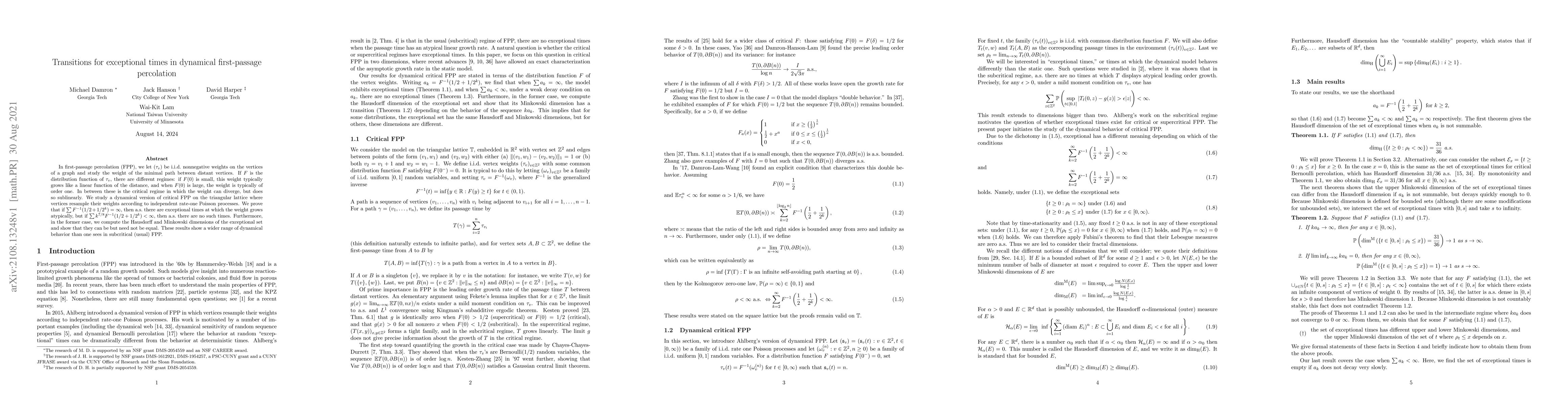This paper investigates dynamical first-passage percolation on the triangular lattice, where vertex weights are updated via independent Poisson processes. It identifies exceptional times where the weight grows unusually large, proving conditions under which such times occur or do not occur, and computes the dimensions of the set of these exceptional times.