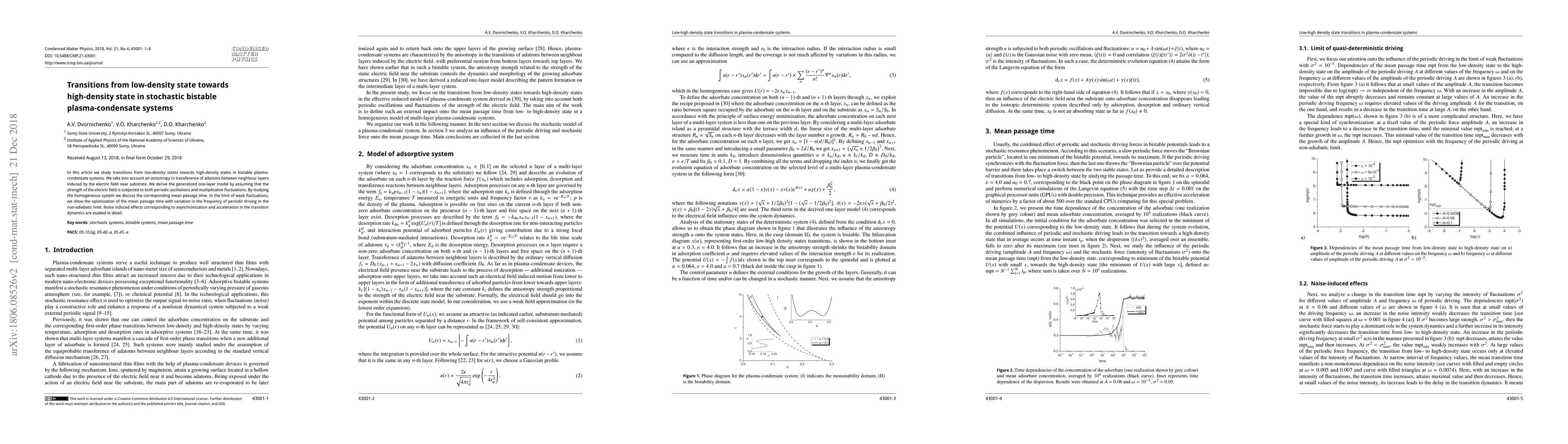 In this article we study transitions from low-density states towards high-density states in bistable plasma-condensate systems. We take into account an anisotropy in transference of adatoms between neighbour layers induced by the electric field near substrate. We derive the generalized one-layer model by assuming that the strength of the electric field is subjected to both periodic oscillations and multiplicative fluctuations. By studying the homogeneous system we discuss the corresponding mean passage time. In the limit of weak fluctuations, we show the optimization of the mean passage time with variation in the frequency of periodic driving in the non-adiabatic limit. Noise induced effects corresponding to asynchronization and acceleration in the transition dynamics are studied in detail.
