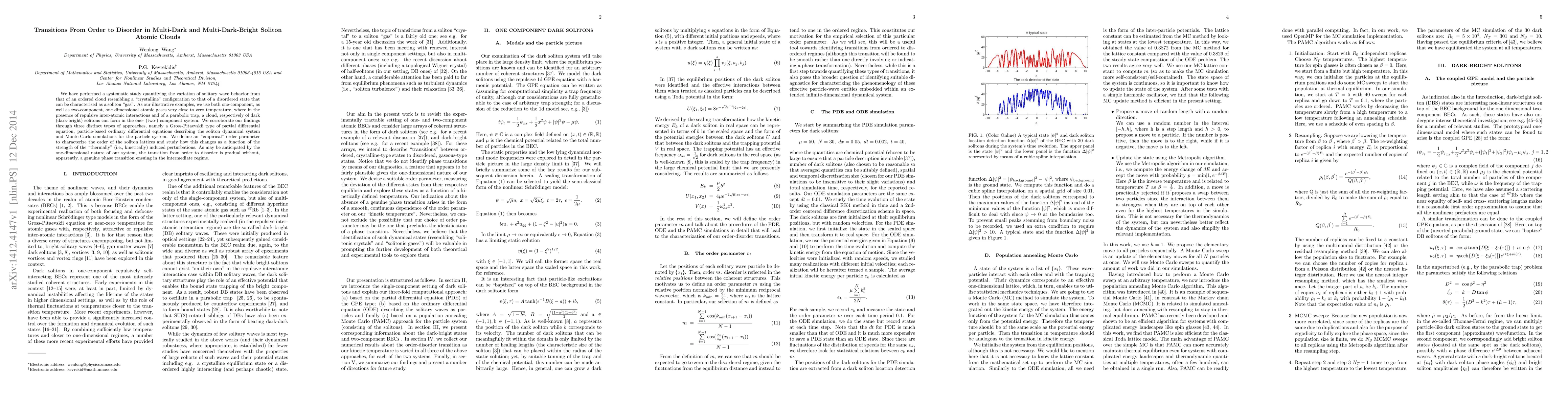We have performed a systematic study quantifying the variation of solitary wave behavior from that of an ordered cloud resembling a "crystalline" configuration to that of a disordered state that can be characterized as a soliton "gas". As our illustrative examples, we use both one-component, as well as two-component, one dimensional atomic gases very close to zero temperature, where in the presence of repulsive inter-atomic interactions and of a parabolic trap, a cloud, respectively of dark (dark-bright) solitons can form in the one- (two-) component system. We corroborate our findings through three distinct types of approaches, namely a Gross-Pitaevskii type of partial differential equation, particle-based ordinary differential equations describing the soliton dynamical system and Monte-Carlo simulations for the particle system. We define an "empirical" order parameter to characterize the order of the soliton lattices and study how this changes as a function of the strength of the "thermally" (i.e., kinetically) induced perturbations. As may be anticipated by the one-dimensional nature of our system, the transition from order to disorder is gradual without, apparently, a genuine phase transition ensuing in the intermediate regime.