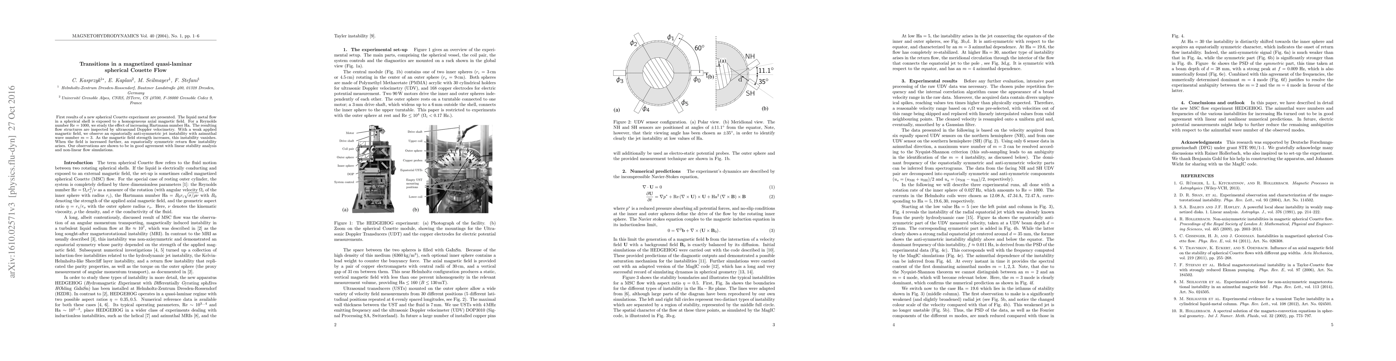 First results of a new spherical Couette experiment are presented. The liquid metal flow in a spherical shell is exposed to a homogeneous axial magnetic field. For a Reynolds number Re=1000, we study the effect of increasing Hartmann number Ha. The resulting flow structures are inspected by ultrasound Doppler velocimetry. With a weak applied magnetic field, we observe an equatorially anti-symmetric jet instability with azimuthal wave number m=3. As the magnetic field strength increases, this instability vanishes. When the field is increased further, an equatorially symmetric return flow instability arises. Our observations are shown to be in good agreement with linear stability analysis and non-linear flow simulations.