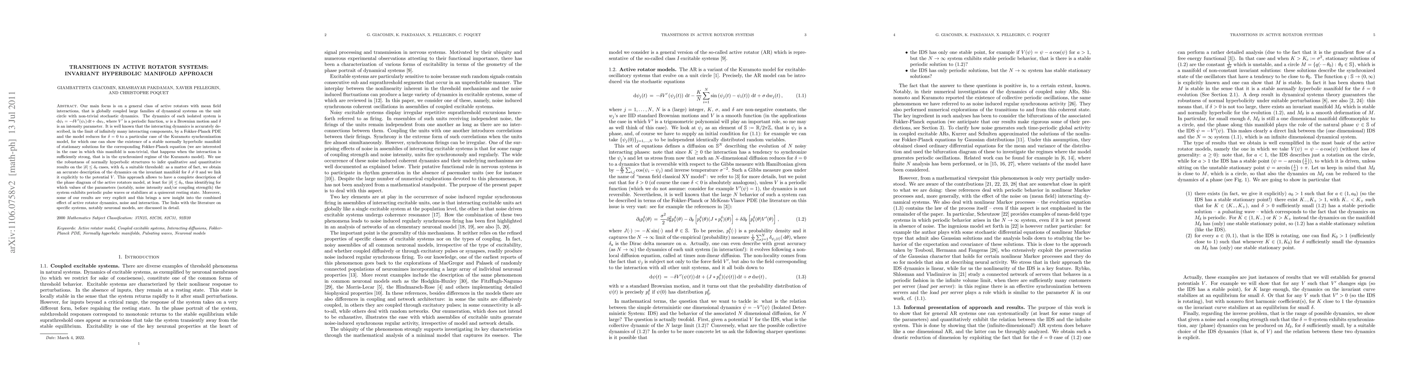 Our main focus is on a general class of active rotators with mean field interactions, that is globally coupled large families of dynamical systems on the unit circle with non-trivial stochastic dynamics. Each isolated system is a diffusion process on a circle, with drift -delta V', where V' is a periodic function and delta is an intensity parameter. It is well known that the interacting dynamics is accurately described, in the limit of infinitely many interacting components, by a Fokker-Planck PDE and the model reduces for delta=0 to a particular case of the Kuramoto synchronization model, for which one can show the existence of a stable normally hyperbolic manifold of stationary solutions for the corresponding Fokker-Planck equation (we are interested in the case in which this manifold is non-trivial, that happens when the interaction is sufficiently strong, that is in the synchronized regime of the Kuramoto model). We use the robustness of normally hyperbolic structures to infer qualitative and quantitative results on the |delta|< delta0 cases, with delta0 a suitable threshold: as a matter of fact, we obtain an accurate description of the dynamics on the invariant manifold for delta=0 and we link it explicitly to the potential V . This approach allows to have a complete description of the phase diagram of the active rotators model, at least for |delta|< delta0, thus identifying for which values of the parameters (notably, noise intensity and/or coupling strength) the system exhibits periodic pulse waves or stabilizes at a quiescent resting state. Moreover, some of our results are very explicit and this brings a new insight into the combined effect of active rotator dynamics, noise and interaction. The links with the literature on specific systems, notably neuronal models, are discussed in detail.