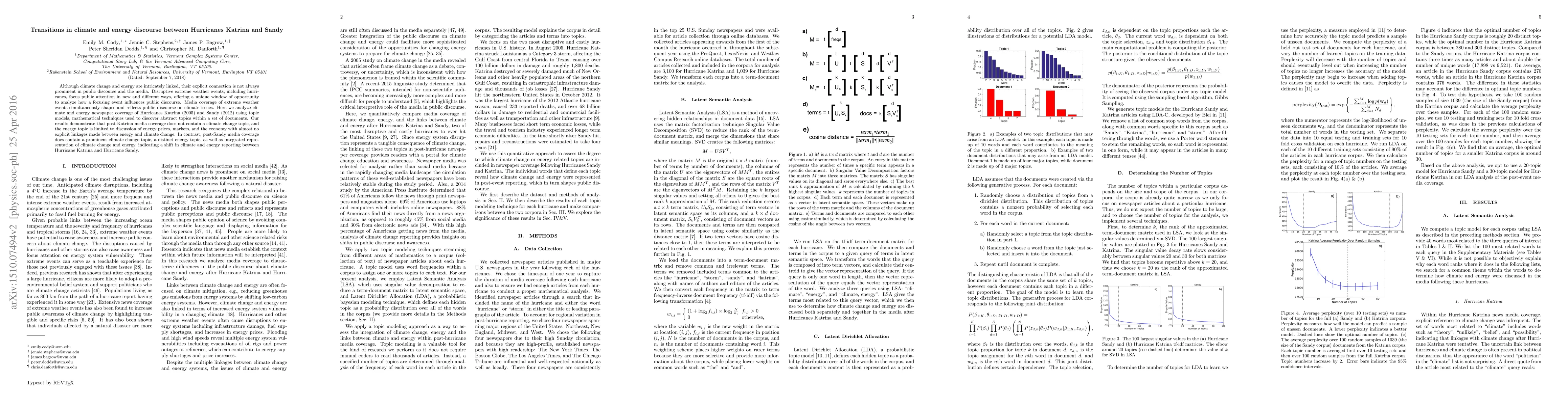 This paper examines shifts in climate and energy discourse in media coverage following Hurricanes Katrina (2005) and Sandy (2012), revealing that post-Katrina coverage lacked explicit climate change discussions, while post-Sandy coverage prominently featured both climate change and energy topics, indicating a notable change in public discourse.