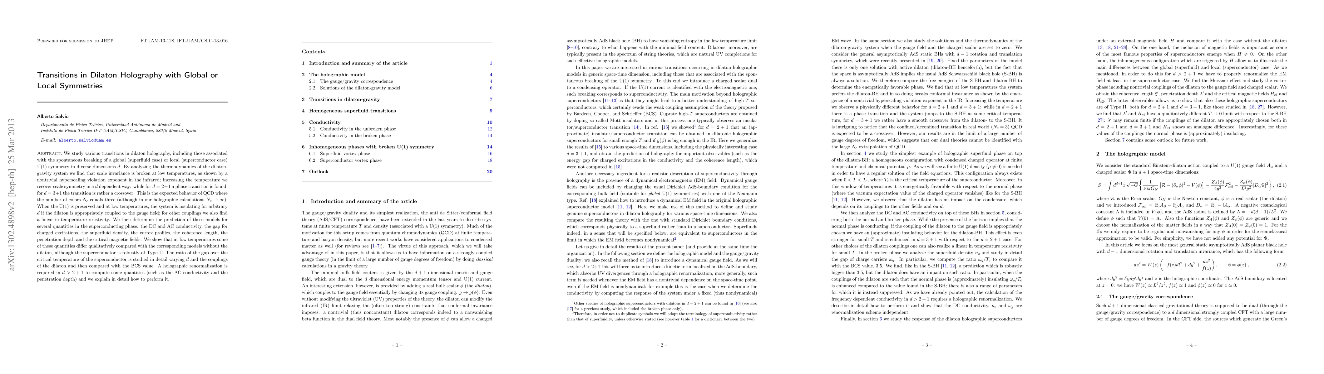 We study various transitions in dilaton holography, including those associated with the spontaneous breaking of a global (superfluid case) or local (superconductor case) U(1) symmetry in diverse dimensions d. By analyzing the thermodynamics of the dilaton-gravity system we find that scale invariance is broken at low temperatures, as shown by a nontrivial hyperscaling violation exponent in the infrared; increasing the temperature we recover scale symmetry in a d dependent way: while for d=2+1 a phase transition is found, for d=3+1 the transition is rather a crossover. This is the expected behavior of QCD where the number of colors N_c equals three (although in our holographic calculations N_c goes to infinity). When the U(1) is preserved and at low temperatures, the system is insulating for arbitrary d if the dilaton is appropriately coupled to the gauge field; for other couplings we also find a linear in temperature resistivity. We then determine the prediction of these models for several quantities in the superconducting phase: the DC and AC conductivity, the gap for charged excitations, the superfluid density, the vortex profiles, the coherence length, the penetration depth and the critical magnetic fields. We show that at low temperatures some of these quantities differ qualitatively compared with the corresponding models without the dilaton, although the superconductor is robustly of Type II. The ratio of the gap over the critical temperature of the superconductor is studied in detail varying d and the couplings of the dilaton and then compared with the BCS value. A holographic renormalization is required in d>2+1 to compute some quantities (such as the AC conductivity and the penetration depth) and we explain in detail how to perform it.