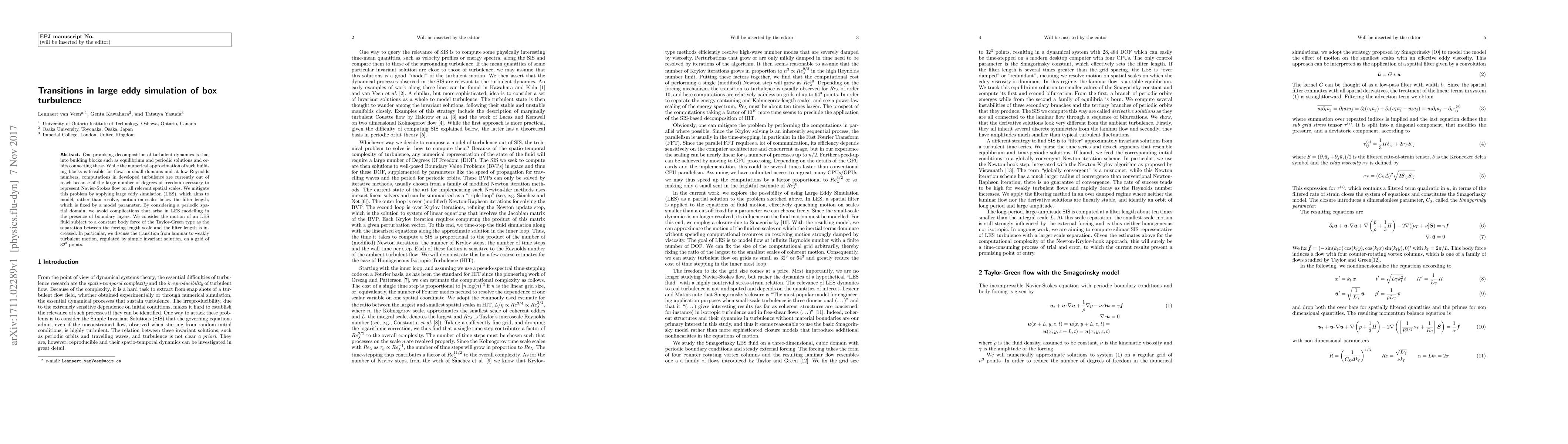 One promising decomposition of turbulent dynamics is that into building blocks such as equilibrium and periodic solutions and orbits connecting these. While the numerical approximation of such building blocks is feasible for flows in small domains and at low Reynolds numbers, computations in developed turbulence are currently out of reach because of the large number of degrees of freedom necessary to represent Navier-Stokes flow on all relevant spatial scales. We mitigate this problem by applying large eddy simulation (LES), which aims to model, rather than resolve, motion on scales below the filter length, which is fixed by a model parameter. By considering a periodic spatial domain, we avoid complications that arise in LES modelling in the presence of boundary layers. We consider the motion of an LES fluid subject to a constant body force of the Taylor-Green type as the separation between the forcing length scale and the filter length is increased. In particular, we discuss the transition from laminar to weakly turbulent motion, regulated by simple invariant solution, on a grid of $32^3$ points.