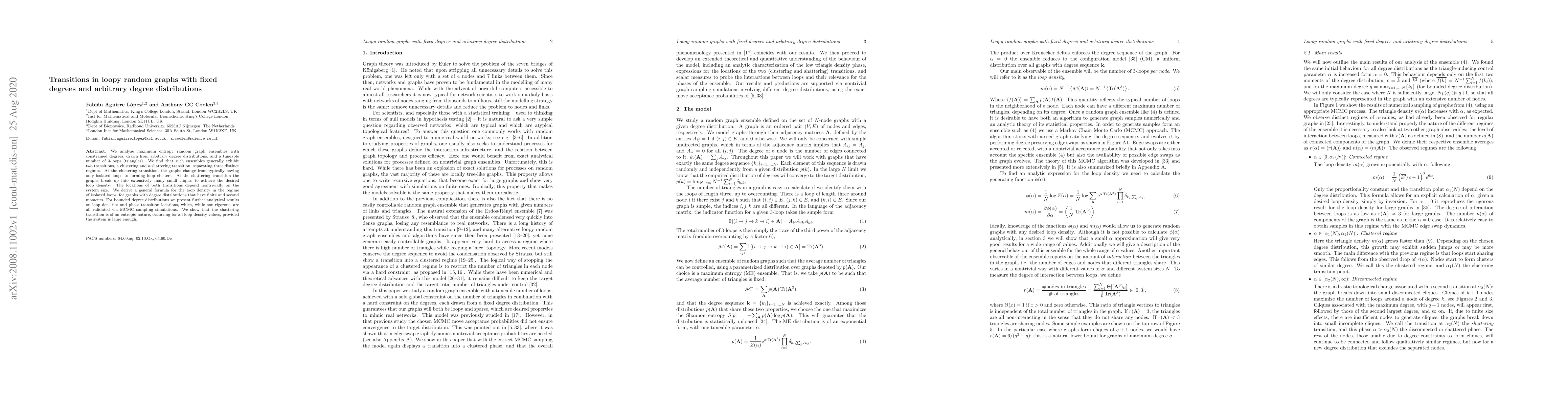 This paper investigates maximum entropy random graph ensembles with fixed degrees and arbitrary degree distributions, identifying two key transitions: a clustering transition and a shattering transition. These transitions delineate three distinct regimes, with the shattering transition being entropic and dependent on system size.