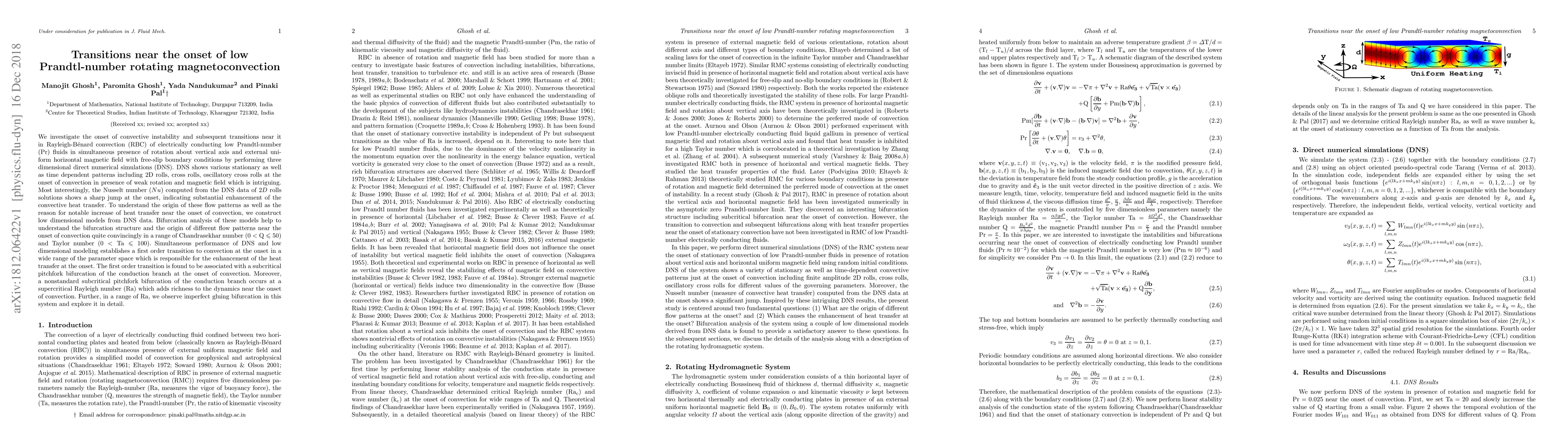 We investigate the onset of convective instability and subsequent transitions near it in Rayleigh-B\'enard convection (RBC) of electrically conducting low Prandtl-number (Pr) fluids in the simultaneous presence of rotation about the vertical axis and external uniform horizontal magnetic field with free-slip boundary conditions. Both three dimensional direct numerical simulations (DNS) and low dimensional modeling of the system have been performed for the investigation. DNS results show a plethora of patterns near the onset of convection for weak magnetic field. Most interestingly, the Nusselt number (Nu) computed from the DNS data for relatively stronger magnetic field shows a sharp jump at the onset, indicating substantial enhancement of the convective heat transfer. The origin of these flow patterns, as well as the reason for a notable increase of heat transfer near the onset of convection, are then explained using low dimensional models constructed from DNS data.