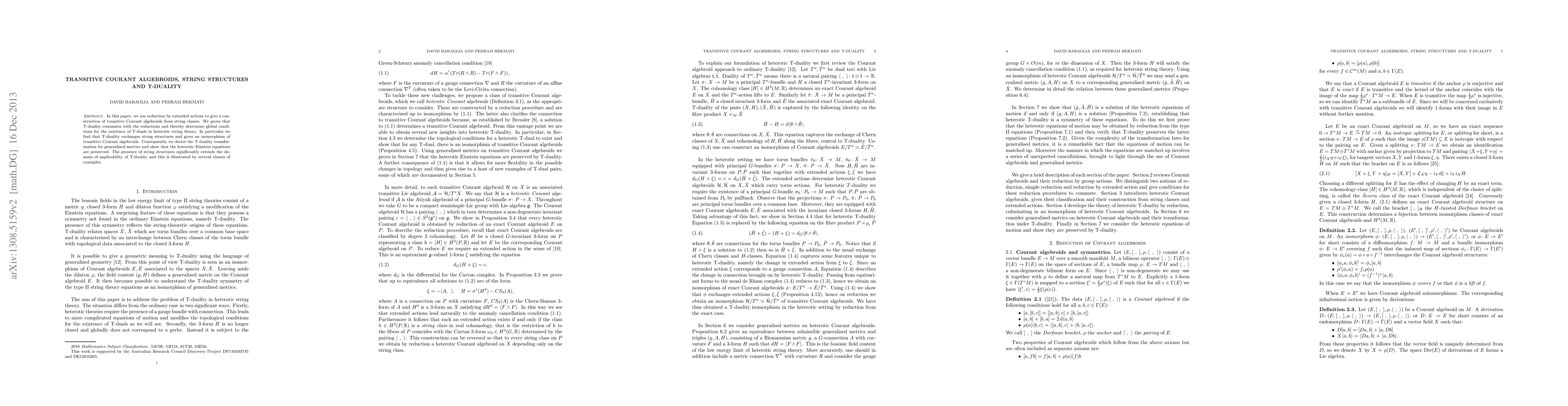 This paper constructs transitive Courant algebroids from string classes via reduction by extended actions and demonstrates that T-duality commutes with these reductions, revealing global conditions for T-dual existence in heterotic string theory. It concludes that T-duality exchanges string structures and preserves heterotic Einstein equations.