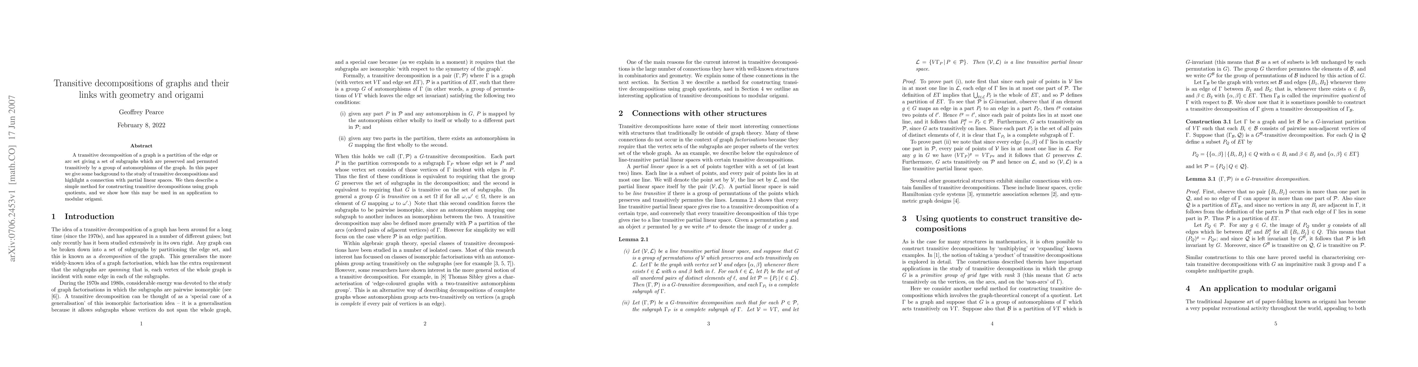 This paper explores transitive decompositions of graphs, linking them to partial linear spaces and introducing a method for constructing these decompositions via graph quotients. It also demonstrates an application in modular origami.