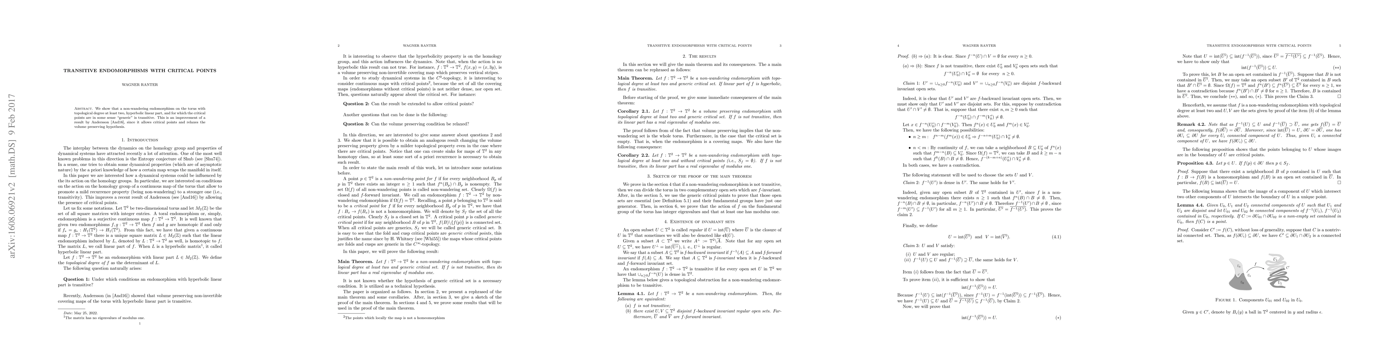 We show that a non-wandering endomorphism of the torus with invertible linear part without invariant directions and for which the critical points are in some sense generic is transitive. This improves a result of Andersson by allowing critical points and improving the volume preserving assumption.