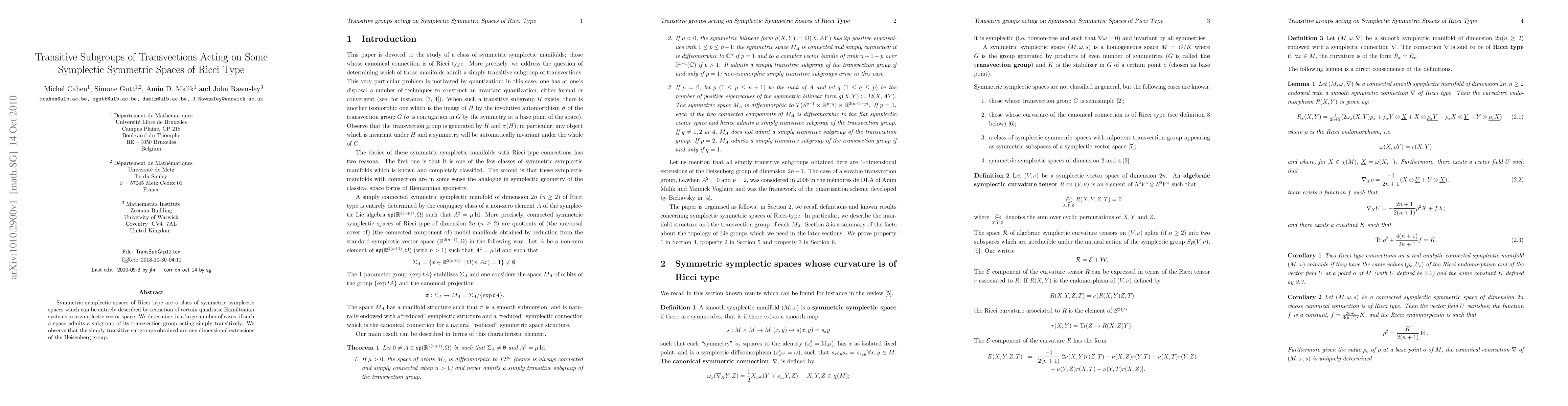 This paper investigates transitive subgroups within the transvection group of symmetric symplectic spaces of Ricci type, finding that many such spaces contain simply transitive subgroups which are one-dimensional extensions of the Heisenberg group.