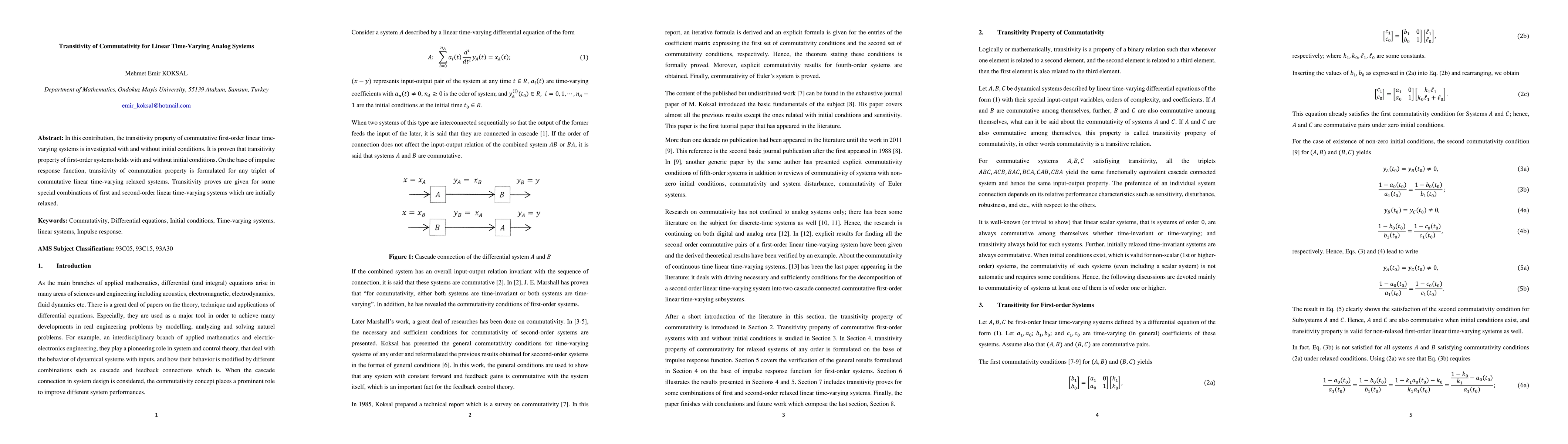 This paper investigates the transitivity of commutativity in first-order linear time-varying systems, proving that this property holds both with and without initial conditions. It extends the transitivity of commutation to any triplet of commutative systems based on the impulse response function, and provides proofs for specific combinations of first and second-order systems.