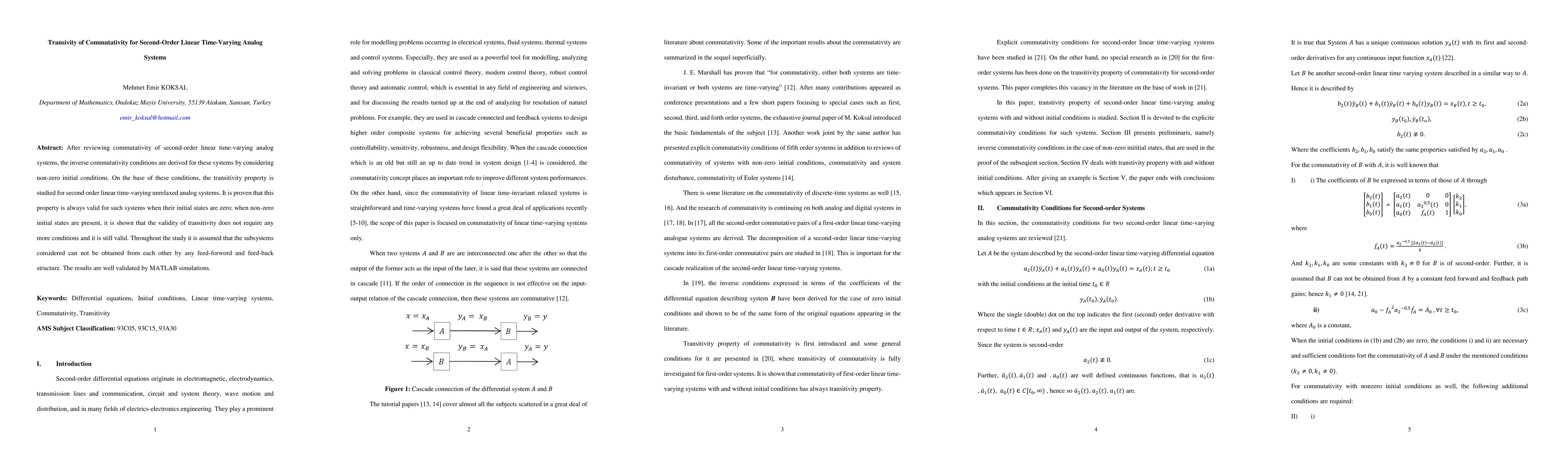 After reviewing commutativity of second-order linear time-varying analog systems, the inverse commutativity conditions are derived for these systems by considering non-zero initial conditions. On the base of these conditions, the transitivity property is studied for second order linear time-varying unrelaxed analog systems. It is proven that this property is always valid for such systems when their initial states are zero; when non-zero initial states are present, it is shown that the validity of transitivity does not require any more conditions and it is still valid. Throughout the study it is assumed that the subsystems considered can not be obtained from each other by any feed-forward and feed-back structure. The results are well validated by MATLAB simulations.