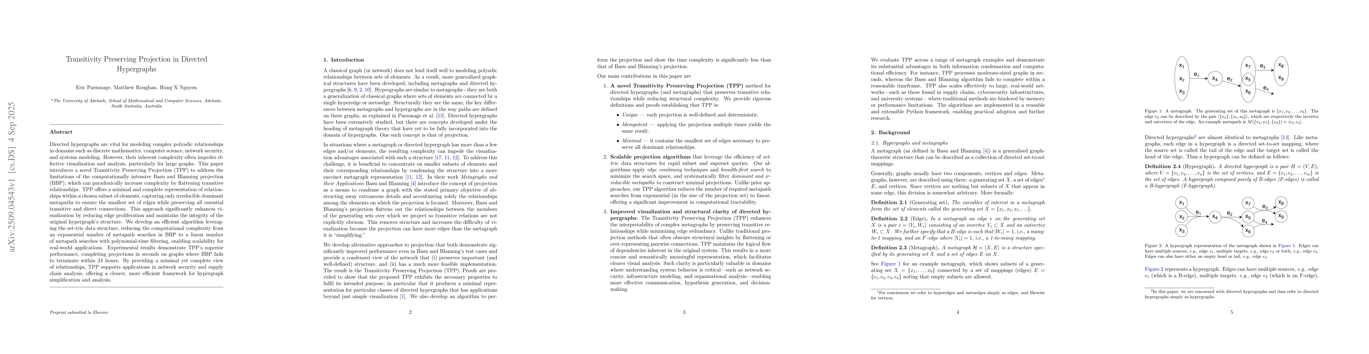 Directed hypergraphs are vital for modeling complex polyadic relationships in domains such as discrete mathematics, computer science, network security, and systems modeling. However, their inherent complexity often impedes effective visualization and analysis, particularly for large graphs. This paper introduces a novel Transitivity Preserving Projection (TPP) to address the limitations of the computationally intensive Basu and Blanning projection (BBP), which can paradoxically increase complexity by flattening transitive relationships. TPP offers a minimal and complete representation of relationships within a chosen subset of elements, capturing only irreducible dominant metapaths to ensure the smallest set of edges while preserving all essential transitive and direct connections. This approach significantly enhances visualization by reducing edge proliferation and maintains the integrity of the original hypergraph's structure. We develop an efficient algorithm leveraging the set-trie data structure, reducing the computational complexity from an exponential number of metapath searches in BBP to a linear number of metapath searches with polynomial-time filtering, enabling scalability for real-world applications. Experimental results demonstrate TPP's superior performance, completing projections in seconds on graphs where BBP fails to terminate within 24 hours. By providing a minimal yet complete view of relationships, TPP supports applications in network security and supply
