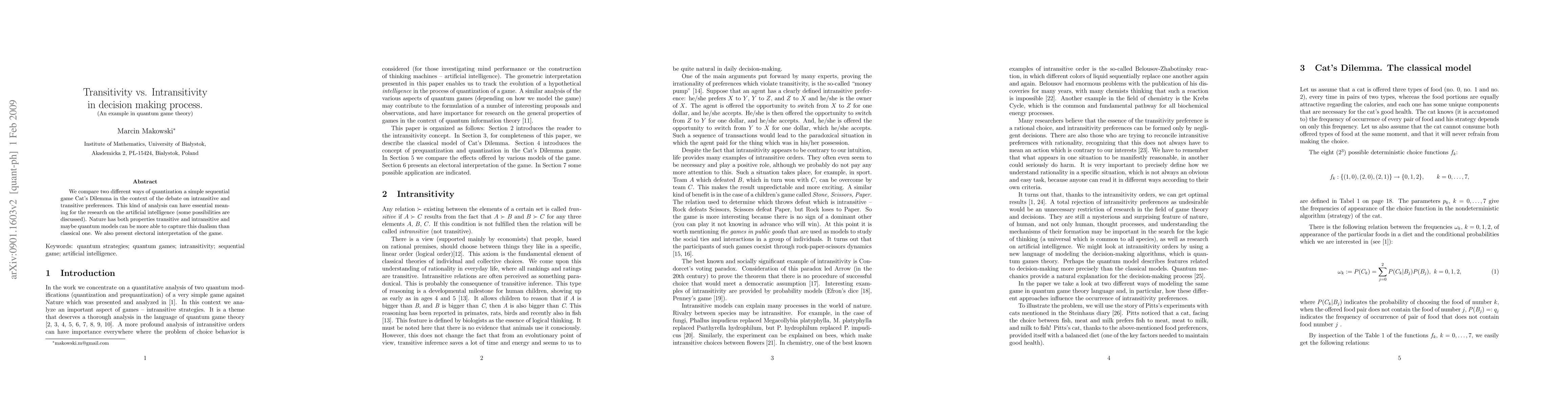 We compare two different ways of quantization a simple sequential game Cat's Dilemma in the context of the debate on intransitive and transitive preferences. This kind of analysis can have essential meaning for the research on the artificial intelligence (some possibilities are discussed). Nature has both properties transitive and intransitive and maybe quantum models can be more able to capture this dualism than classical one. We also present electoral interpretation of the game.