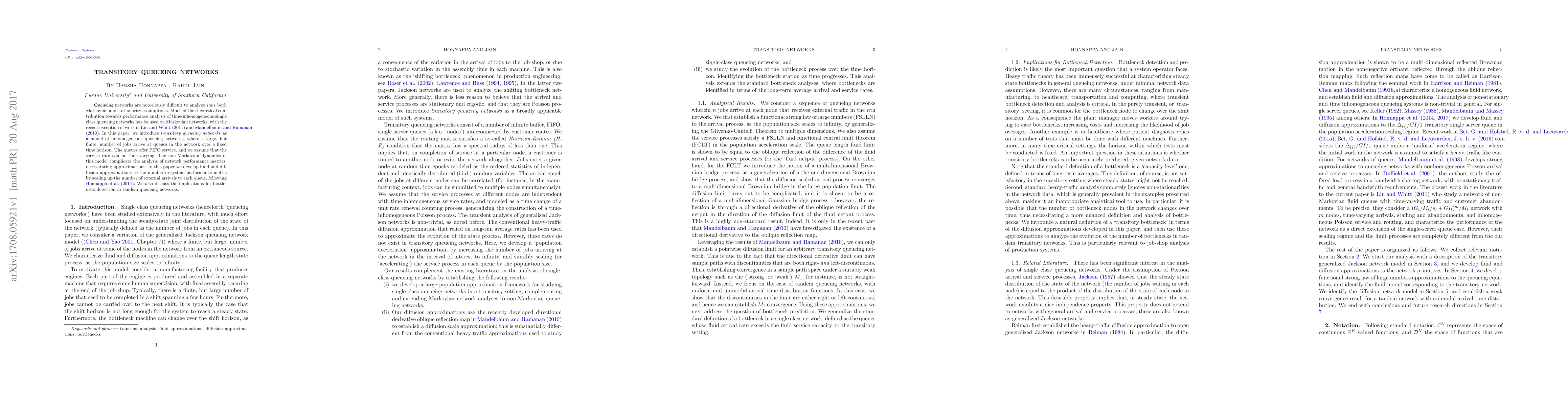 This paper introduces transitory queueing networks to model time-inhomogeneous queueing networks without Markovian or stationarity assumptions. It develops fluid and diffusion approximations for performance metrics and discusses implications for bottleneck detection in tandem networks.