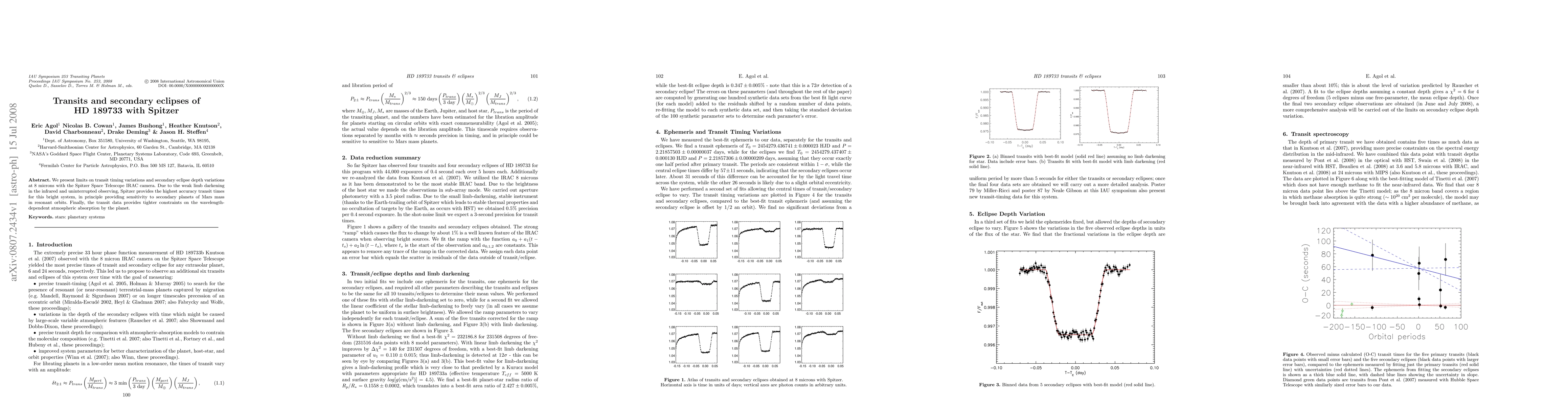 This study uses Spitzer Space Telescope data to set limits on transit timing variations and secondary eclipse depth for HD 189733, achieving high-accuracy transit times due to minimal limb darkening and uninterrupted observations, which also constrains wavelength-dependent atmospheric absorption.