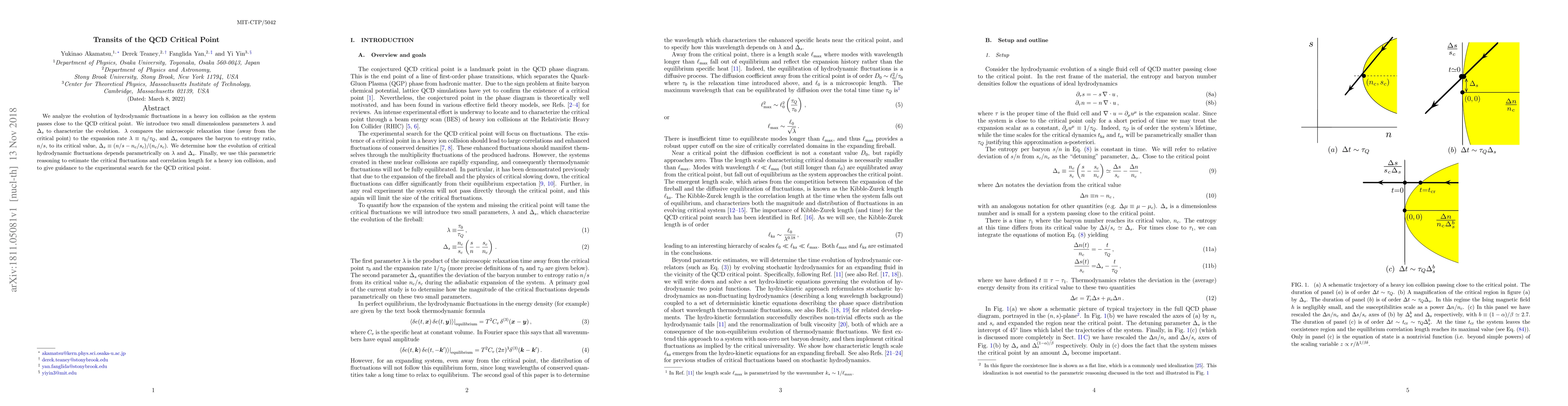This paper investigates the hydrodynamic fluctuations in heavy ion collisions near the QCD critical point, introducing parameters $\lambda$ and $\Delta_s$ to characterize the system's evolution. It provides estimates for critical fluctuations and correlation length, aiding experimental searches for the QCD critical point.
