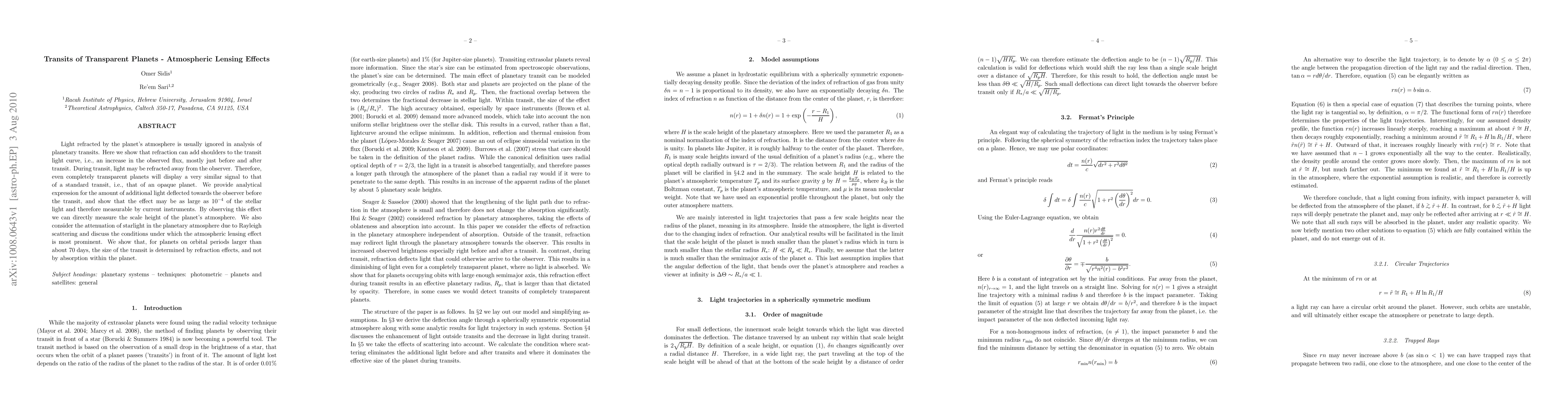Light refracted by the planet's atmosphere is usually ignored in analysis of planetary transits. Here we show that refraction can add shoulders to the transit light curve, i.e., an increase in the observed flux, mostly just before and after transit. During transit, light may be refracted away from the observer. Therefore, even completely transparent planets will display a very similar signal to that of a standard transit, i.e., that of an opaque planet. We provide analytical expression for the amount of additional light deflected towards the observer before the transit, and show that the effect may be as large as $10^{-4}$ of the stellar light and therefore measurable by current instruments. By observing this effect we can directly measure the scale height of the planet's atmosphere. We also consider the attenuation of starlight in the planetary atmosphere due to Rayleigh scattering and discuss the conditions under which the atmospheric lensing effect is most prominent. We show that, for planets on orbital periods larger than about 70 days, the size of the transit is determined by refraction effects, and not by absorption within the planet.