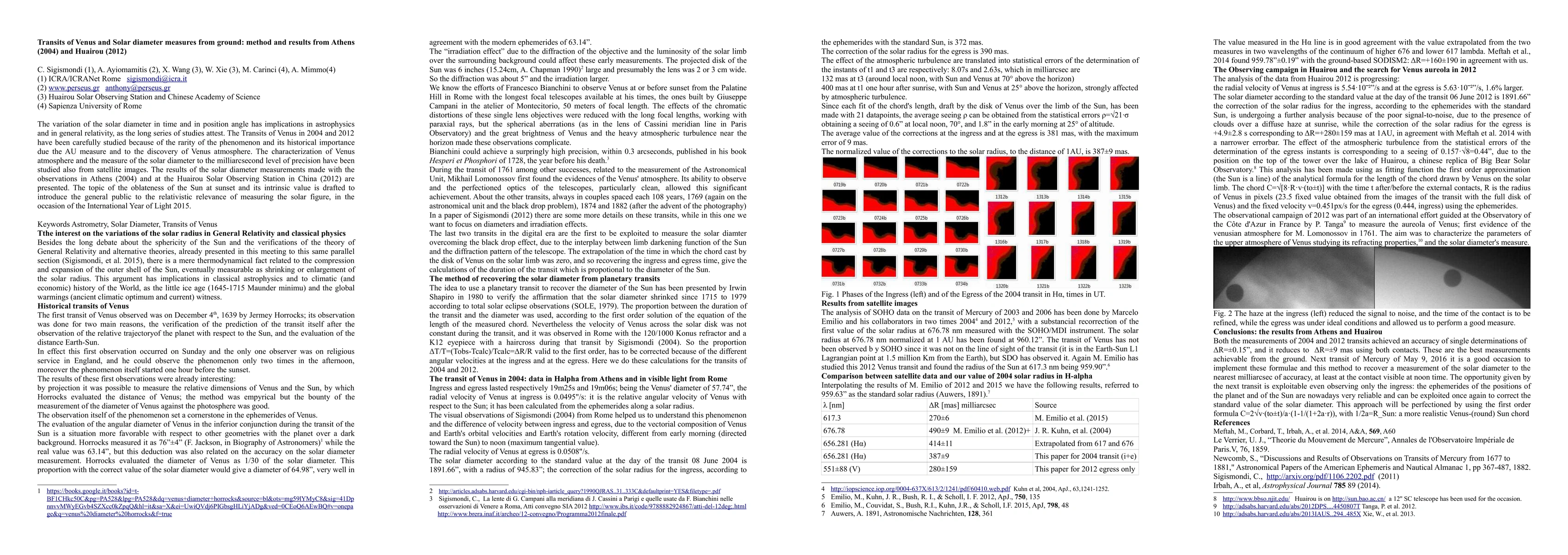 The paper presents solar diameter measurement results from Athens (2004) and Huairou (2012) during Venus transits, crucial for astrophysics and general relativity studies. It also discusses solar oblateness and its relativistic significance, aimed at public understanding, especially for the International Year of Light 2015.