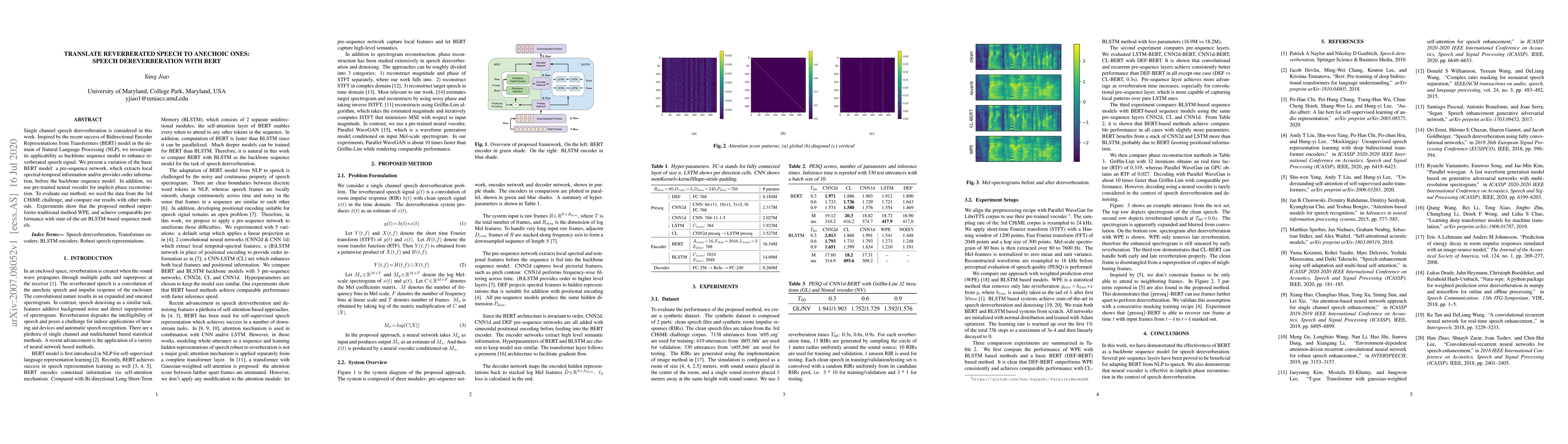 Single channel speech dereverberation is considered in this work. Inspired by the recent success of Bidirectional Encoder Representations from Transformers (BERT) model in the domain of Natural Language Processing (NLP), we investigate its applicability as backbone sequence model to enhance reverberated speech signal. We present a variation of the basic BERT model: a pre-sequence network, which extracts local spectral-temporal information and/or provides order information, before the backbone sequence model. In addition, we use pre-trained neural vocoder for implicit phase reconstruction. To evaluate our method, we used the data from the 3rd CHiME challenge, and compare our results with other methods. Experiments show that the proposed method outperforms traditional method WPE, and achieve comparable performance with state-of-the-art BLSTM-based sequence models.