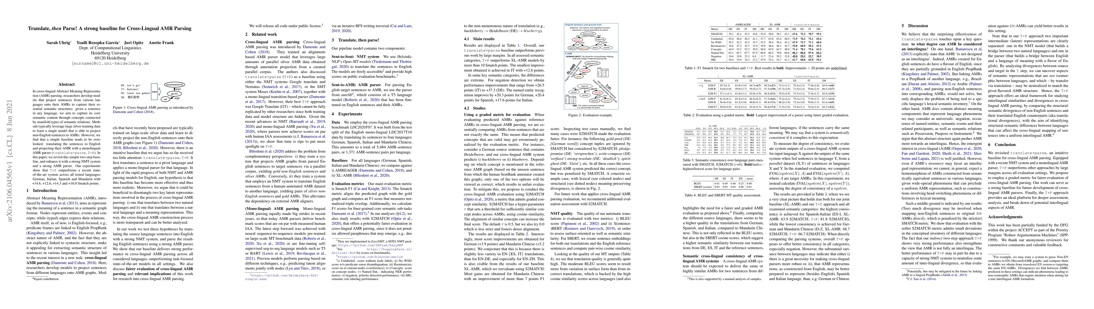 This paper proposes a simple "Translate, then Parse" (T+P) approach for cross-lingual AMR parsing, showing it outperforms recent state-of-the-art methods by leveraging a strong neural machine translation system and a monolingual AMR parser, achieving significant improvements in Smatch scores across German, Italian, Spanish, and Mandarin.