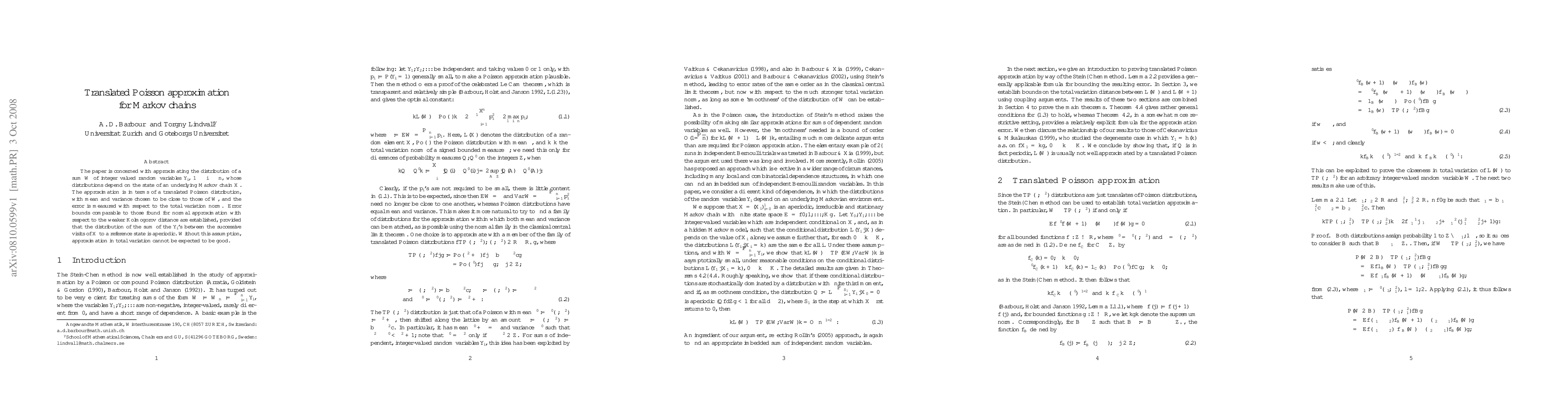 This paper develops a new method for approximating the distribution of the sum of integer-valued random variables dependent on an underlying Markov chain, using a translated Poisson distribution with improved error bounds.