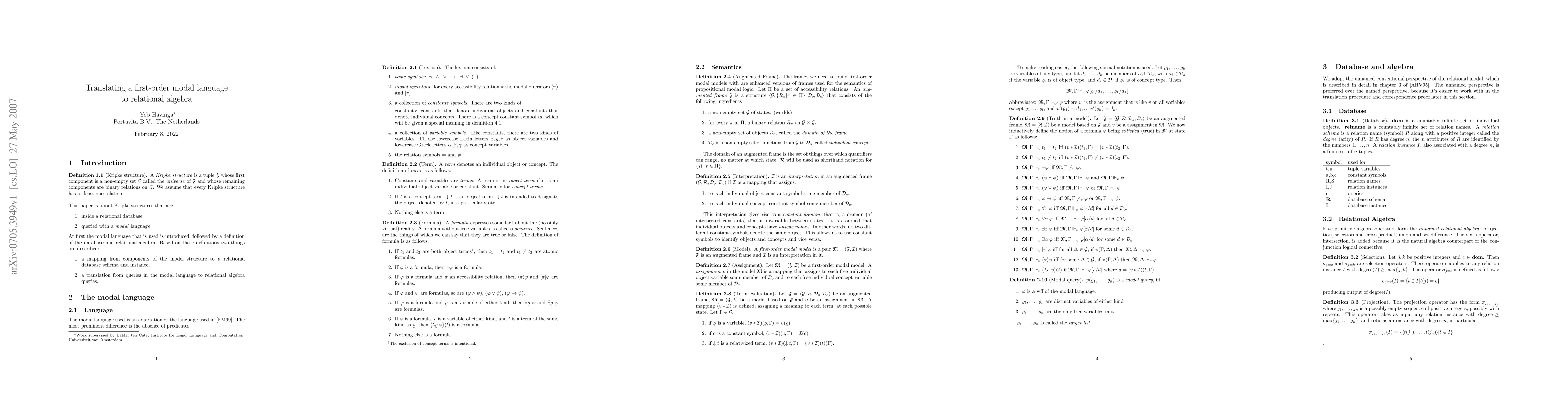 This paper is about Kripke structures that are inside a relational database and queried with a modal language. At first the modal language that is used is introduced, followed by a definition of the database and relational algebra. Based on these definitions two things are presented: a mapping from components of the modal structure to a relational database schema and instance, and a translation from queries in the modal language to relational algebra queries.