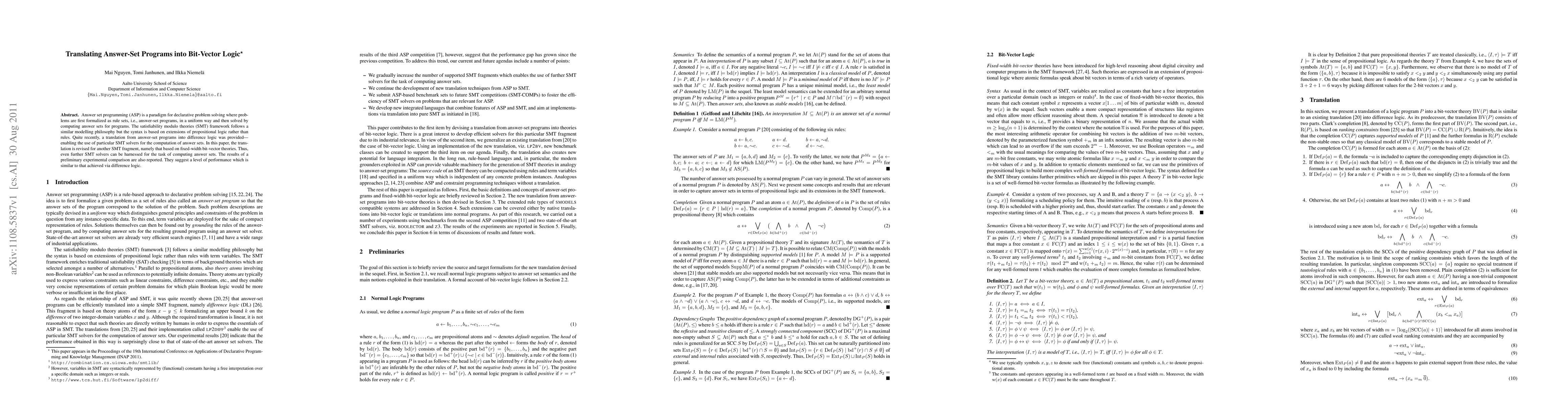 This paper revises the translation of answer-set programs into bit-vector logic, enabling the use of additional SMT solvers for computing answer sets. Preliminary experimental results indicate performance comparable to that using difference logic.