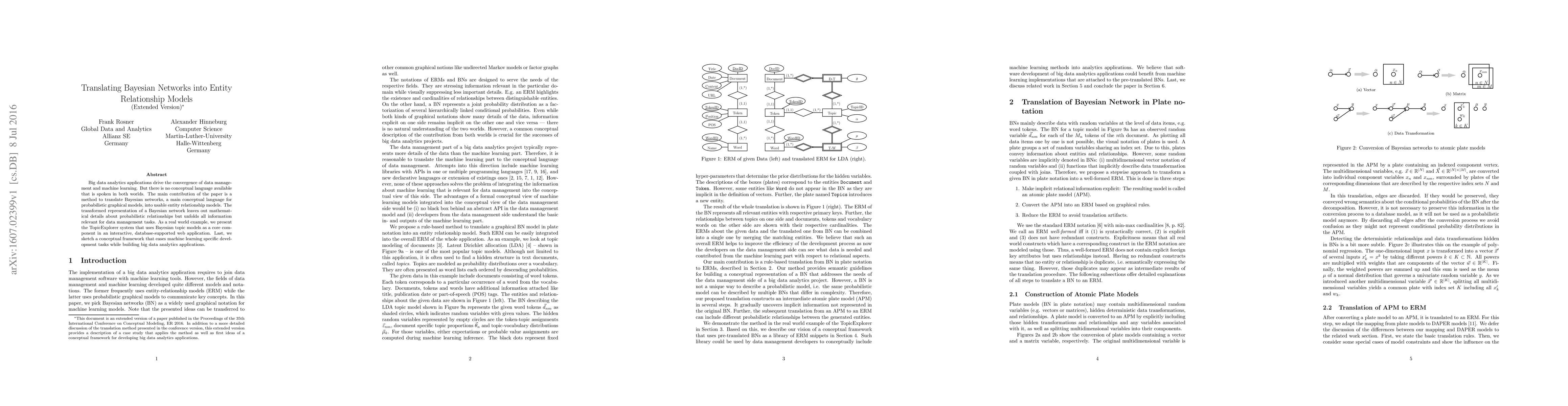 This paper proposes a method to translate Bayesian networks into entity relationship models, bridging data management and machine learning. The translated models retain essential information for data management tasks while omitting probabilistic details. An example application, TopicExplorer, demonstrates the practical use of this translation in a big data analytics context.