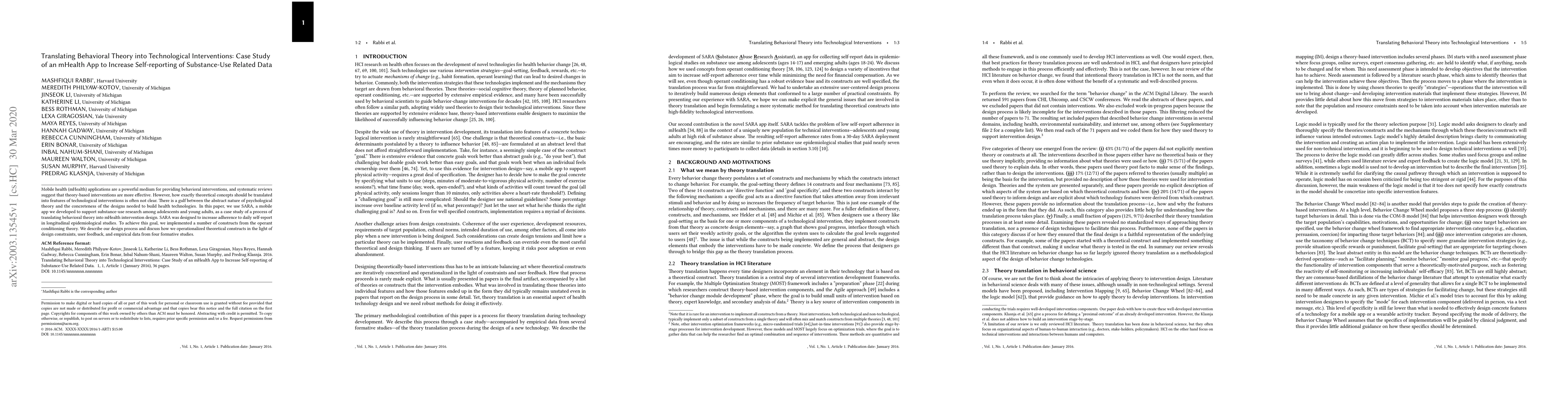 This paper explores the translation of behavioral theory into mHealth app design using SARA, an app aimed at increasing daily self-reporting of substance use among adolescents. The authors detail how constructs from operant conditioning theory were operationalized within the app's features, guided by design constraints, user feedback, and empirical data from formative studies.