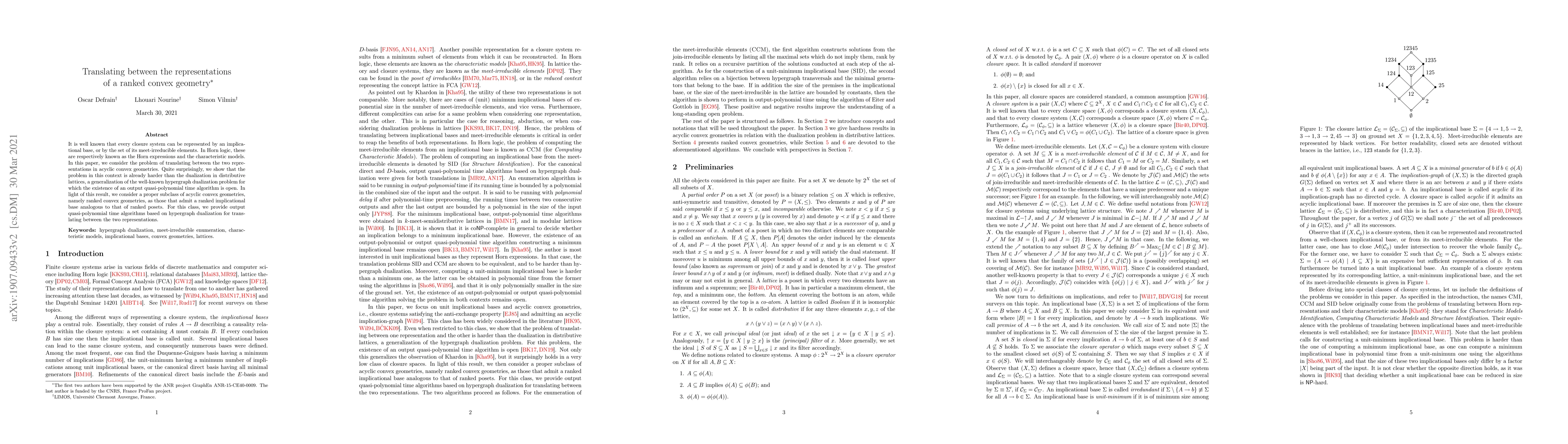 It is well known that every closure system can be represented by an implicational base, or by the set of its meet-irreducible elements. In Horn logic, these are respectively known as the Horn expressions and the characteristic models. In this paper, we consider the problem of translating between the two representations in acyclic convex geometries. Quite surprisingly, we show that the problem in this context is already harder than the dualization in distributive lattices, a generalization of the well-known hypergraph dualization problem for which the existence of an output quasi-polynomial time algorithm is open. In light of this result, we consider a proper subclass of acyclic convex geometries, namely ranked convex geometries, as those that admit a ranked implicational base analogous to that of ranked posets. For this class, we provide output quasi-polynomial time algorithms based on hypergraph dualization for translating between the two representations. This improves the understanding of a long-standing open problem.
