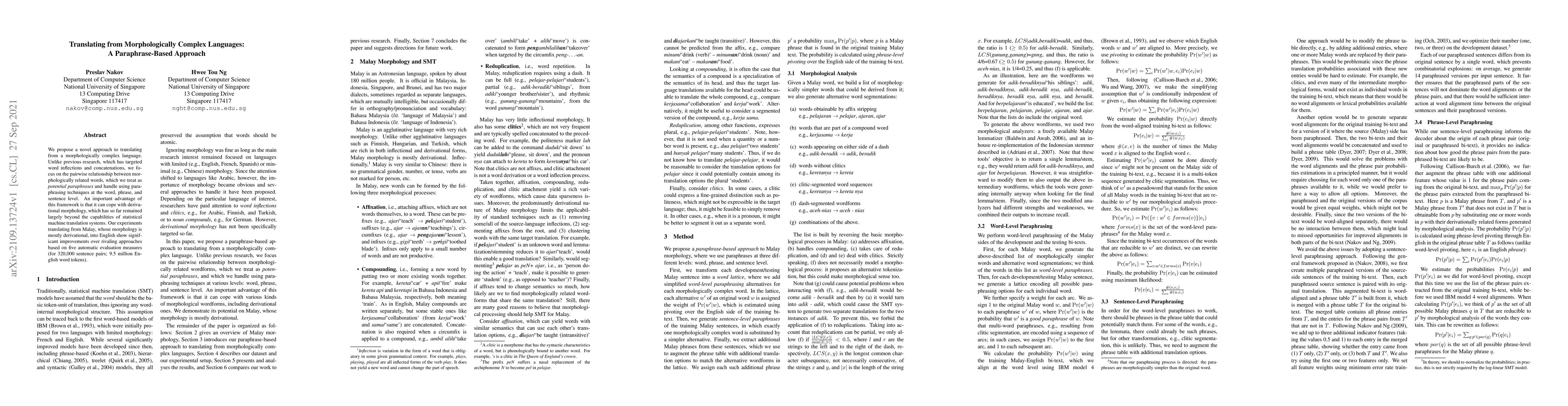 This paper proposes a new approach to translating from morphologically complex languages, focusing on paraphrasing related words and handling derivational morphology with improved results.