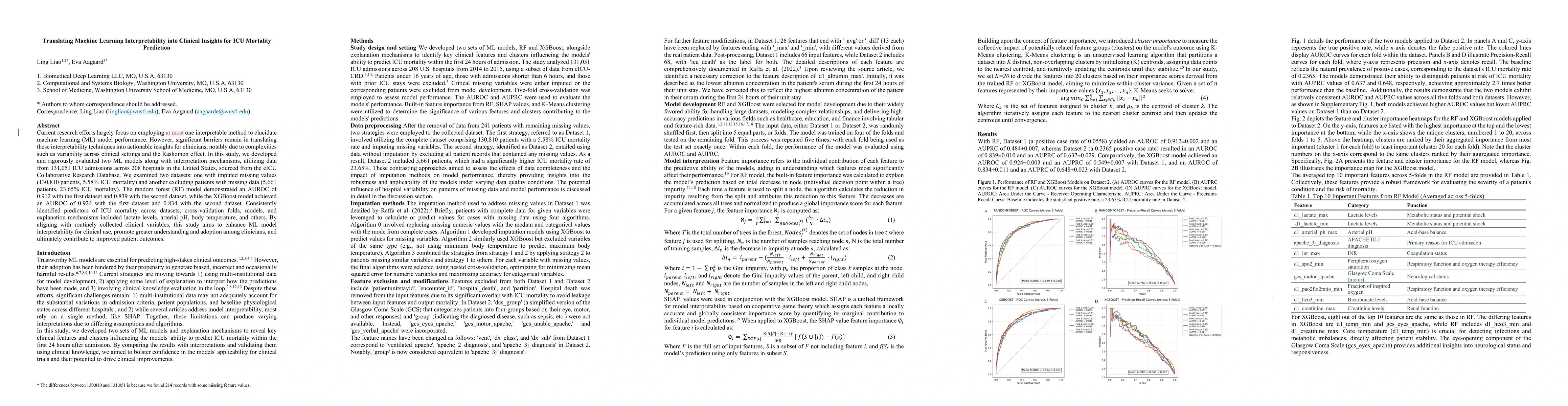 Current research efforts largely focus on employing at most one interpretable method to elucidate machine learning (ML) model performance. However, significant barriers remain in translating these interpretability techniques into actionable insights for clinicians, notably due to complexities such as variability across clinical settings and the Rashomon effect. In this study, we developed and rigorously evaluated two ML models along with interpretation mechanisms, utilizing data from 131,051 ICU admissions across 208 hospitals in the United States, sourced from the eICU Collaborative Research Database. We examined two datasets: one with imputed missing values (130,810 patients, 5.58% ICU mortality) and another excluding patients with missing data (5,661 patients, 23.65% ICU mortality). The random forest (RF) model demonstrated an AUROC of 0.912 with the first dataset and 0.839 with the second dataset, while the XGBoost model achieved an AUROC of 0.924 with the first dataset and 0.834 with the second dataset. Consistently identified predictors of ICU mortality across datasets, cross-validation folds, models, and explanation mechanisms included lactate levels, arterial pH, body temperature, and others. By aligning with routinely collected clinical variables, this study aims to enhance ML model interpretability for clinical use, promote greater understanding and adoption among clinicians, and ultimately contribute to improved patient outcomes.