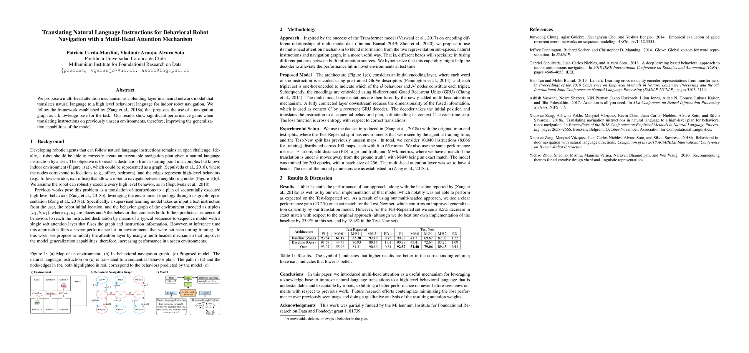 This paper introduces a multi-head attention mechanism to enhance a neural network model translating natural language instructions into high-level behavioral commands for indoor robot navigation. The approach improves the model's generalization to new environments, demonstrating significant performance gains.