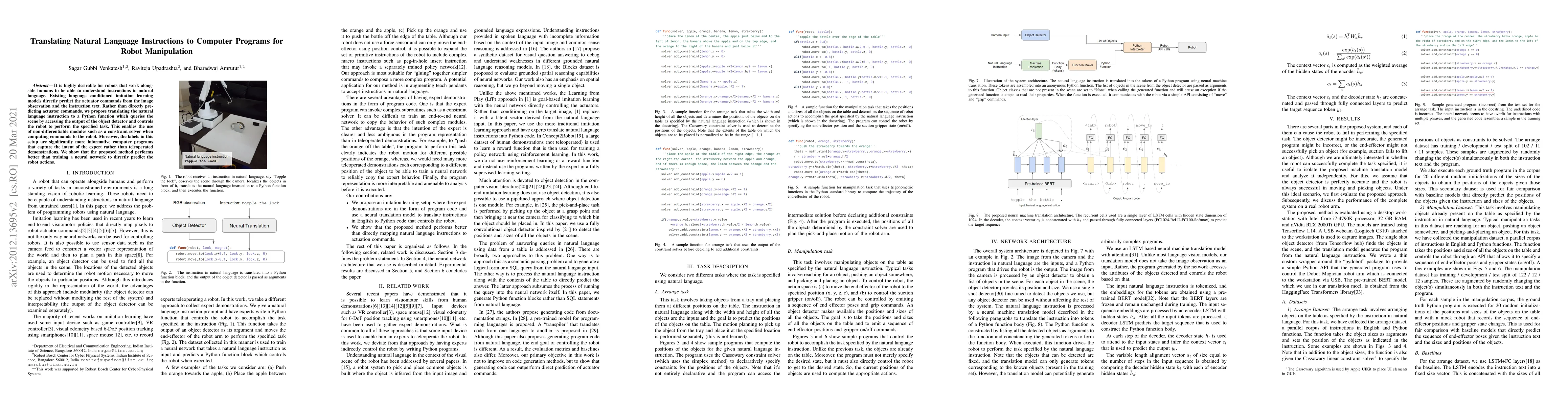 This paper proposes translating natural language instructions into Python functions to control robot manipulation, enabling the use of non-differentiable modules like constraint solvers. The method outperforms direct neural network predictions of robot actions, as it captures the expert's intent through more informative computer programs.