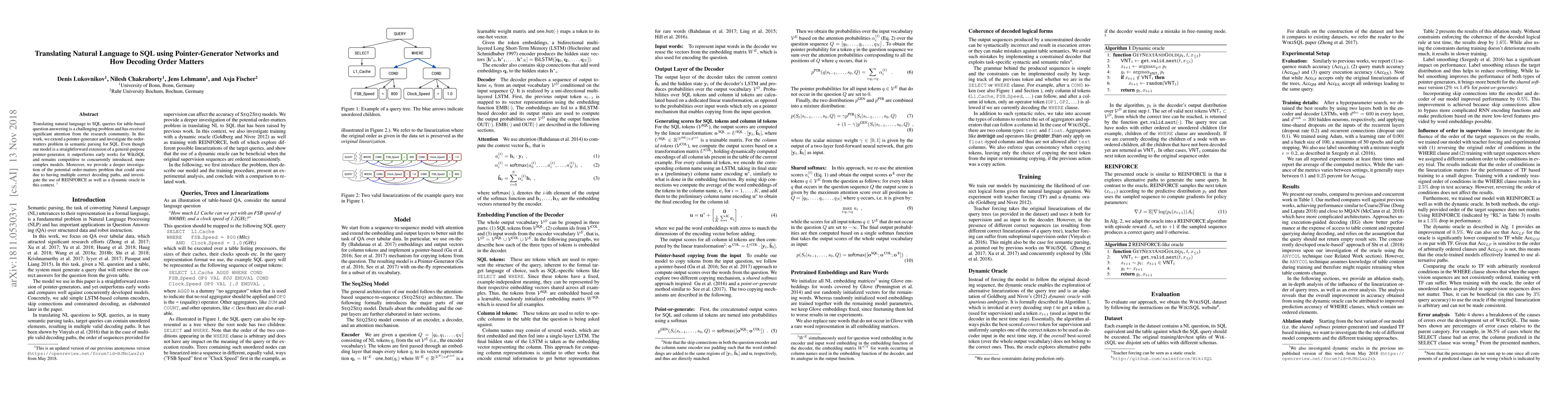 This paper extends a pointer-generator network to translate natural language to SQL, achieving better performance than earlier models for the WikiSQL dataset. It also explores the "order-matters" issue in semantic parsing for SQL, investigating the use of REINFORCE and a dynamic oracle to address potential issues arising from multiple correct decoding paths.