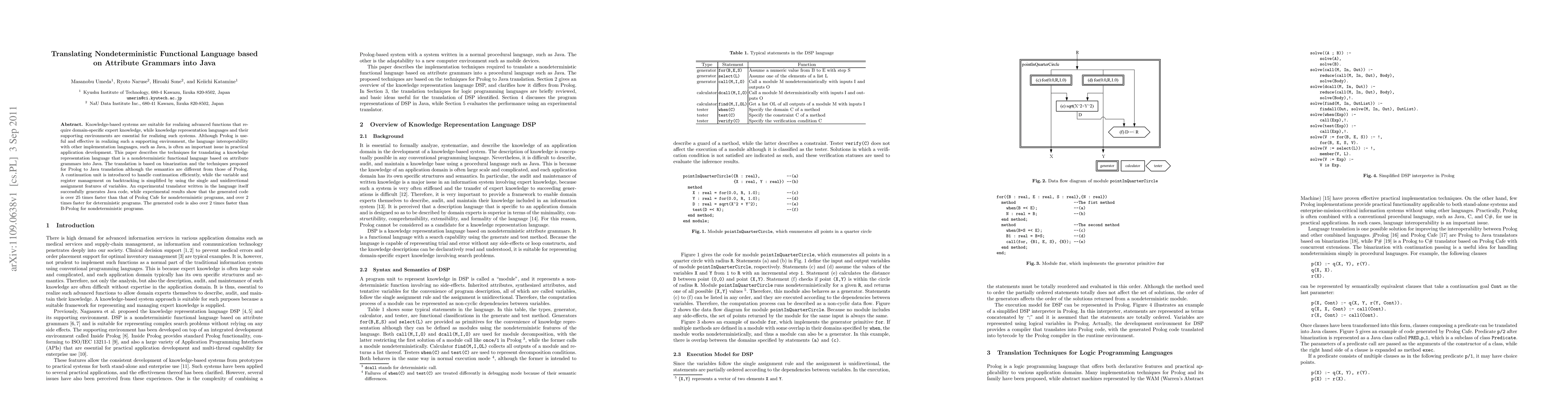 This paper presents techniques for translating a nondeterministic functional language based on attribute grammars into Java, achieving significant performance improvements over Prolog implementations. The translation leverages binarization and introduces a continuation unit for efficient handling, resulting in faster execution times for both deterministic and nondeterministic programs.