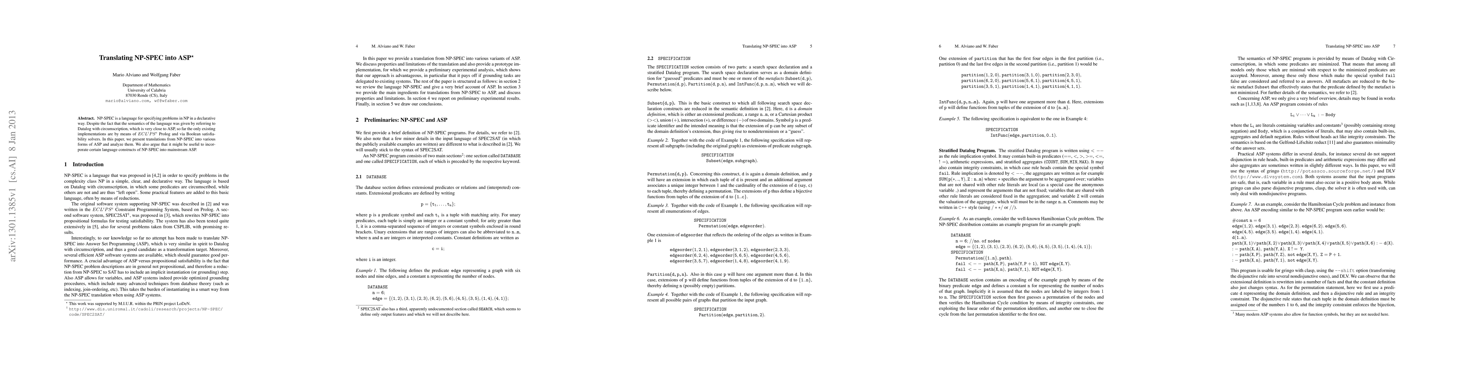 This paper presents translations of NP-SPEC, a declarative language for specifying NP problems, into various forms of ASP. It argues for incorporating certain NP-SPEC constructs into mainstream ASP to enhance its expressiveness.
