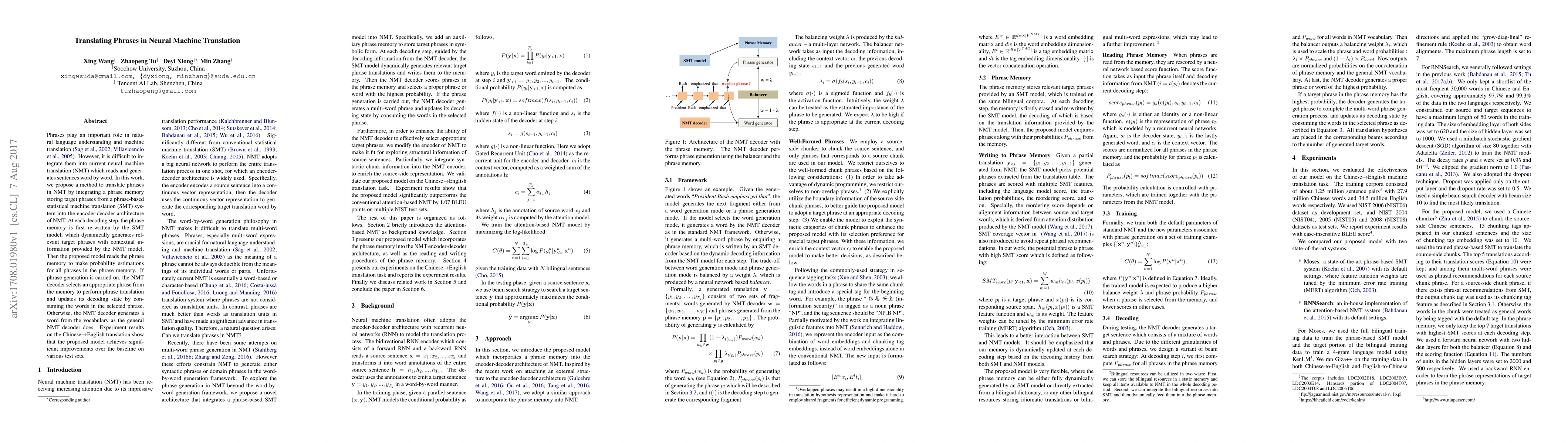 A new neural machine translation method integrates a phrase memory into an encoder-decoder model to improve phrase translation accuracy, achieving significant improvements over baseline models in Chinese-English translations.