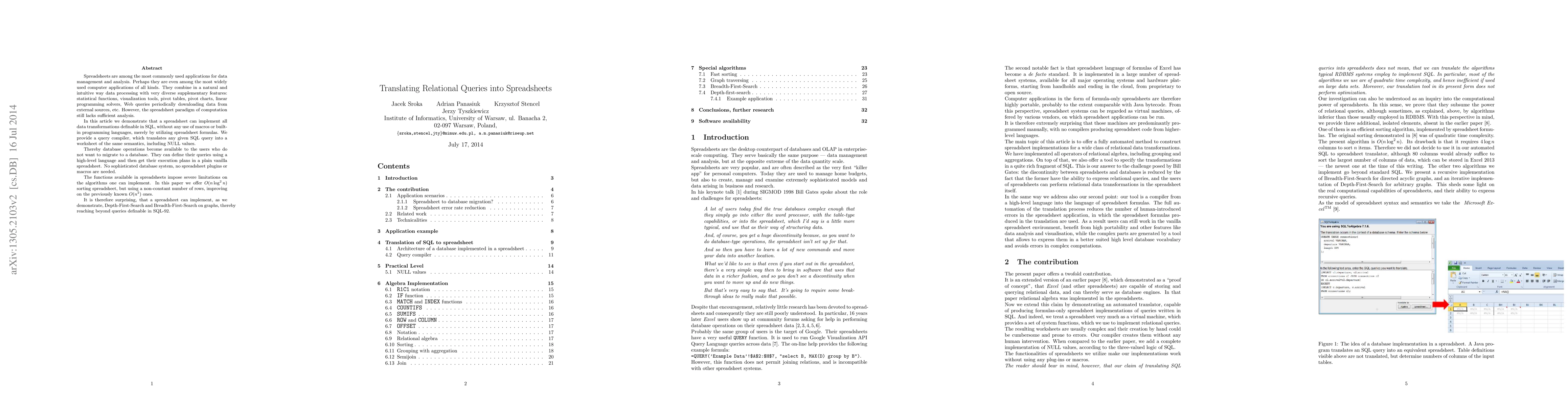 This paper presents a method to translate relational queries expressed in SQL into standard spreadsheet formulas without requiring macros or programming languages. It demonstrates that spreadsheets can implement complex data transformations and algorithms, including Depth-First-Search and Breadth-First-Search, thus extending their utility beyond traditional data analysis.